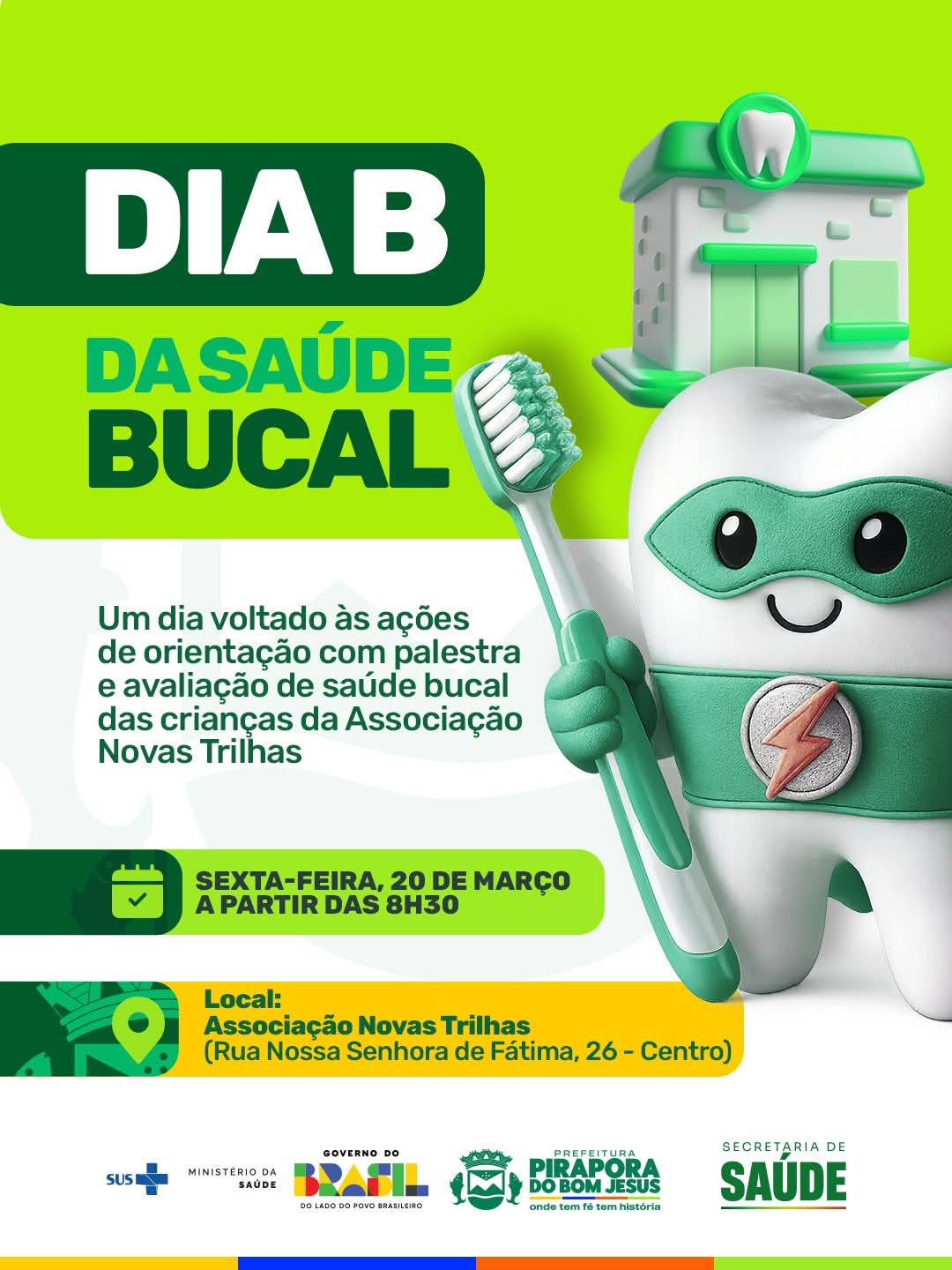 A iniciativa, denominada Dia B da Saúde Bucal, tem como objetivo promover a conscientização sobre a importância dos cuidados com a higiene oral desde a infância. A programação inclui palestra educativa e avaliação da saúde bucal das crianças, proporcionando orientação prática e incentivo à adoção de hábitos saudáveis.