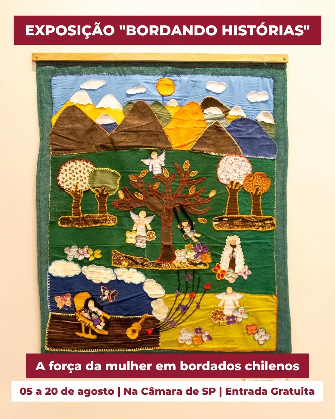 De 5 a 20 de agosto, a Câmara Municipal de São Paulo recebe a exposição “Bordando Histórias”, promovida pelo coletivo Mujeres Arpilleristas, que apresenta ao público uma série de obras produzidas com a técnica chilena das arpilleras — bordados sobre tecido que se tornaram um símbolo de resistência, memória e expressão social, especialmente durante os períodos de repressão política no Chile.