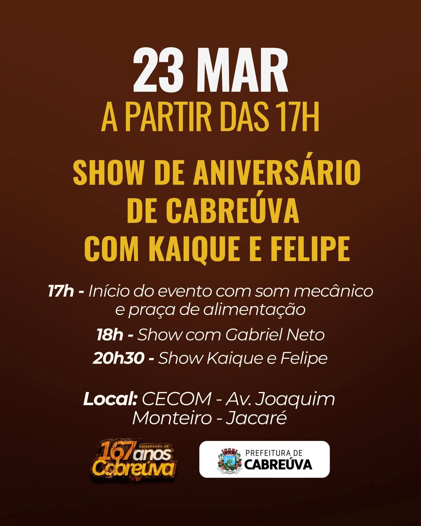 No dia 23 de março, a partir das 17h, o público poderá acompanhar o Show de Aniversário, no CECOM, com apresentações musicais, praça de alimentação e atrações para todas as idades. A noite contará com show de Gabriel Neto e apresentação principal da dupla Kaique e Felipe.