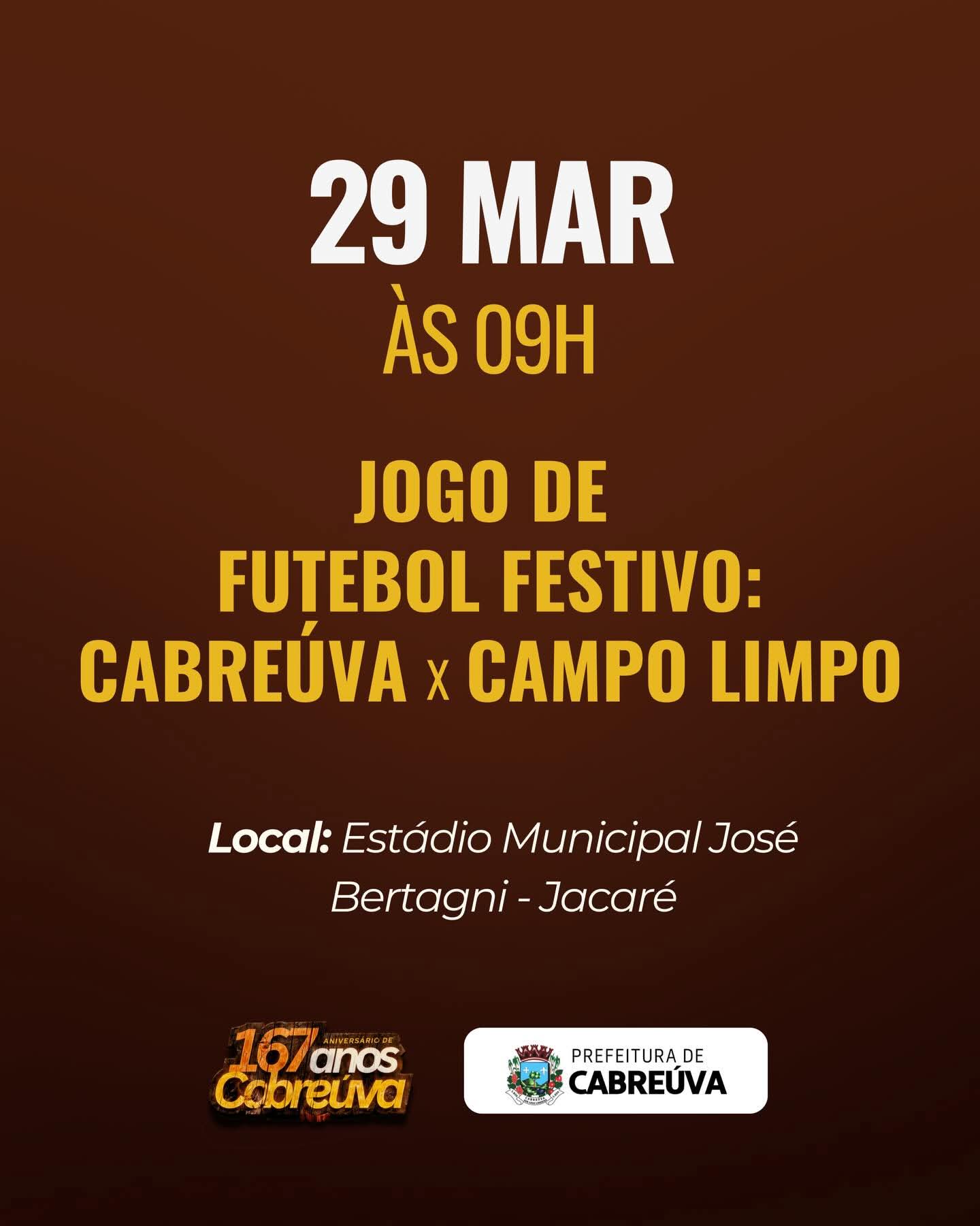 Encerrando a programação, no dia 29 de março, às 9h, será realizado um jogo de futebol festivo entre as equipes de Cabreúva e Campo Limpo Paulista, no Estádio Municipal José Bertagni, no distrito do Jacaré.