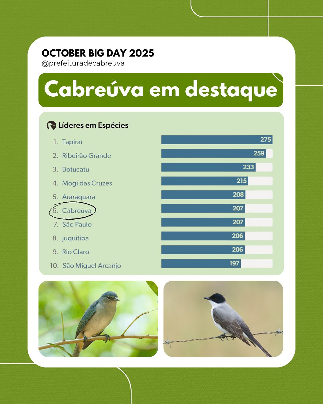 Cabreúva conquistou uma posição de destaque no October Big Day 2025, evento mundial de observação de aves: o município ficou em 6º lugar entre 645 cidades do Estado de São Paulo, registrando impressionantes 207 espécies de aves em apenas um dia.