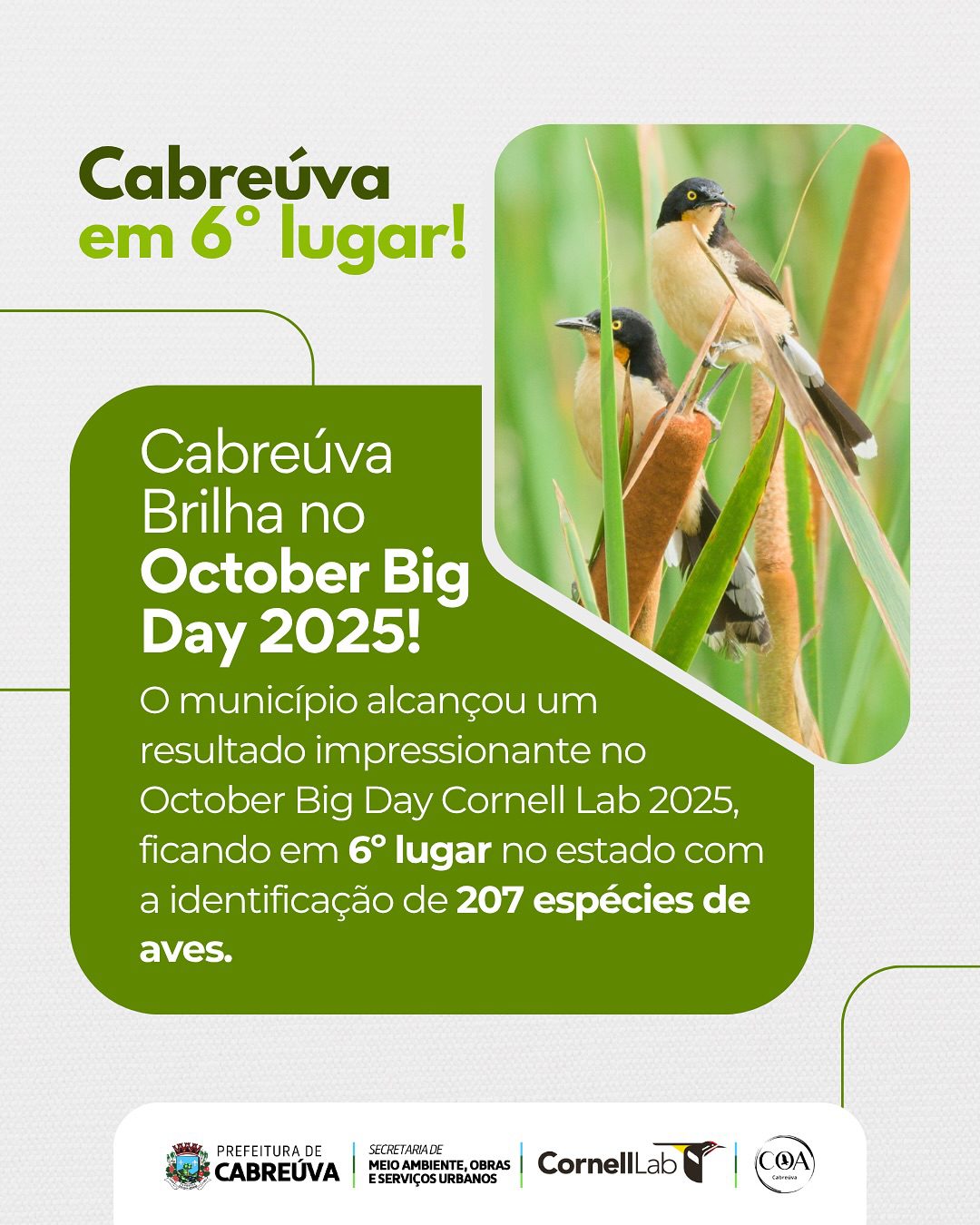 Cabreúva conquistou uma posição de destaque no October Big Day 2025, evento mundial de observação de aves: o município ficou em 6º lugar entre 645 cidades do Estado de São Paulo, registrando impressionantes 207 espécies de aves em apenas um dia.