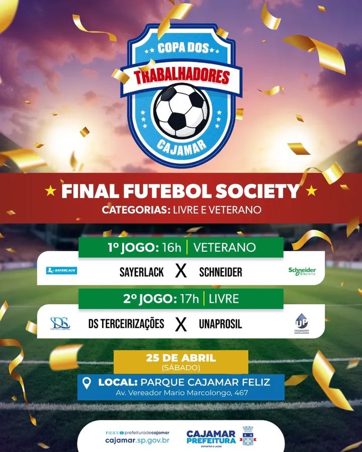 A cidade de Cajamar será palco de grandes emoções neste sábado, dia 25 de abril, com a final da Copa dos Trabalhadores de Futebol Society. As partidas decisivas acontecem no Parque Cajamar Feliz, reunindo atletas e torcedores em uma tarde de esporte e confraternização.
