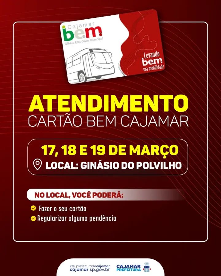A Prefeitura de Cajamar realizará um atendimento especial do Cartão BEM (Bilhete Eletrônico Municipal) nos dias 17, 18 e 19 de março, no Ginásio do Polvilho.
