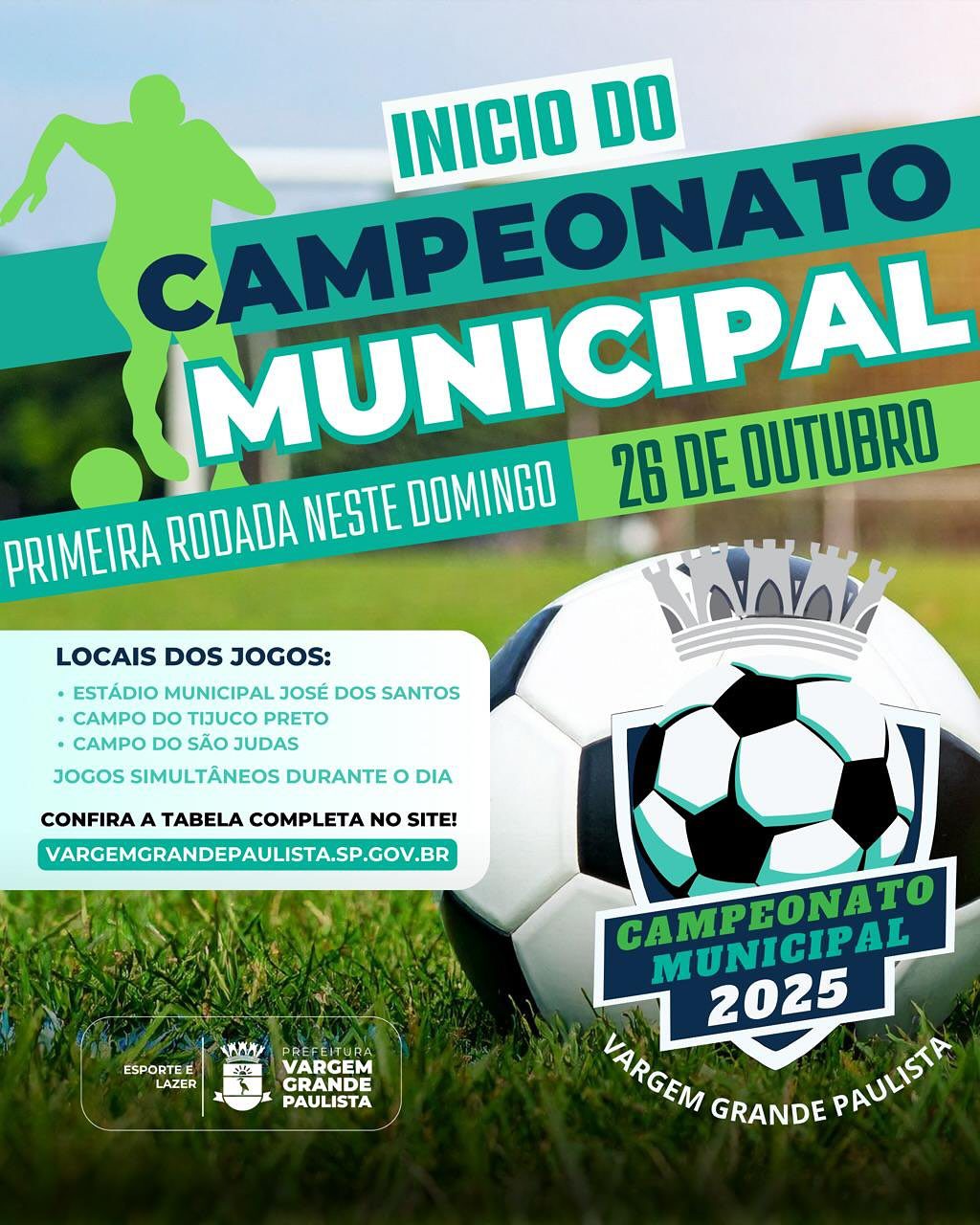 O esporte vai agitar o fim de semana em Vargem Grande Paulista! Neste domingo, 26 de outubro, tem início o Campeonato Municipal de Futebol 2025, com jogos simultâneos nos principais campos da cidade: Estádio Municipal José dos Santos, Campo do Tijuco Preto e Campo do São Judas.