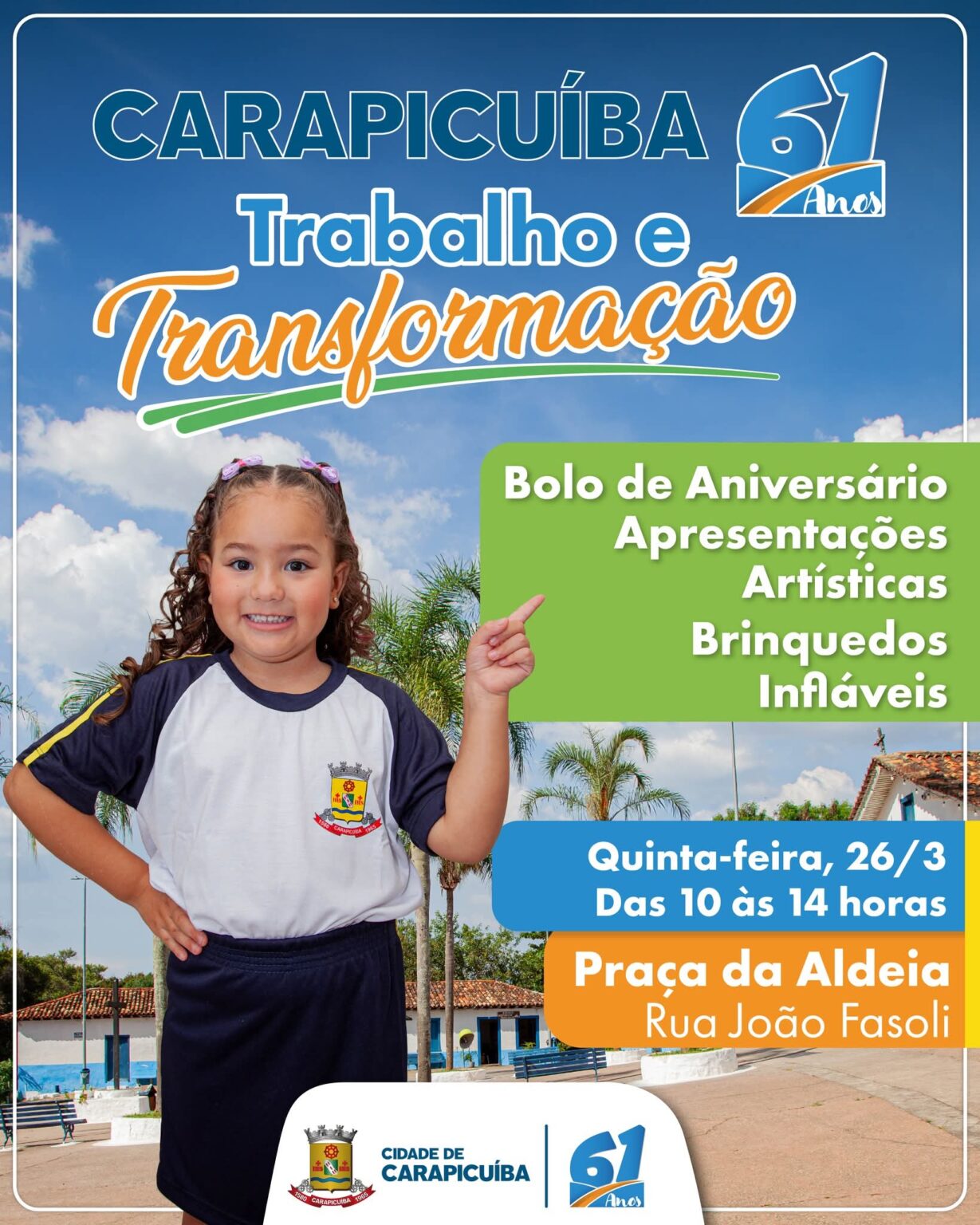 O município de Carapicuíba comemora seus 61 anos de emancipação político-administrativa com uma programação especial preparada para toda a população. A celebração acontece na quinta-feira (26), das 10h às 14h, na Praça da Aldeia, localizada na Rua João Fasoli.