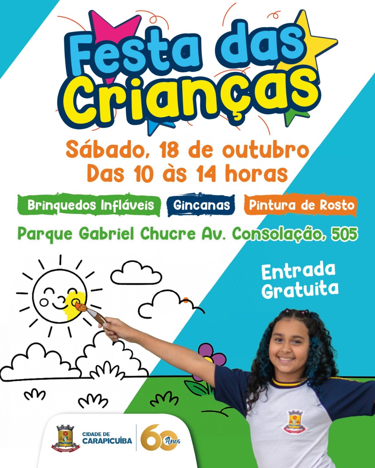 A Prefeitura de Carapicuíba convida todas as famílias para celebrar a Festa das Crianças, no próximo sábado, 18 de outubro, das 10h às 14h, no Parque Gabriel Chucre (Av. Consolação, 505).