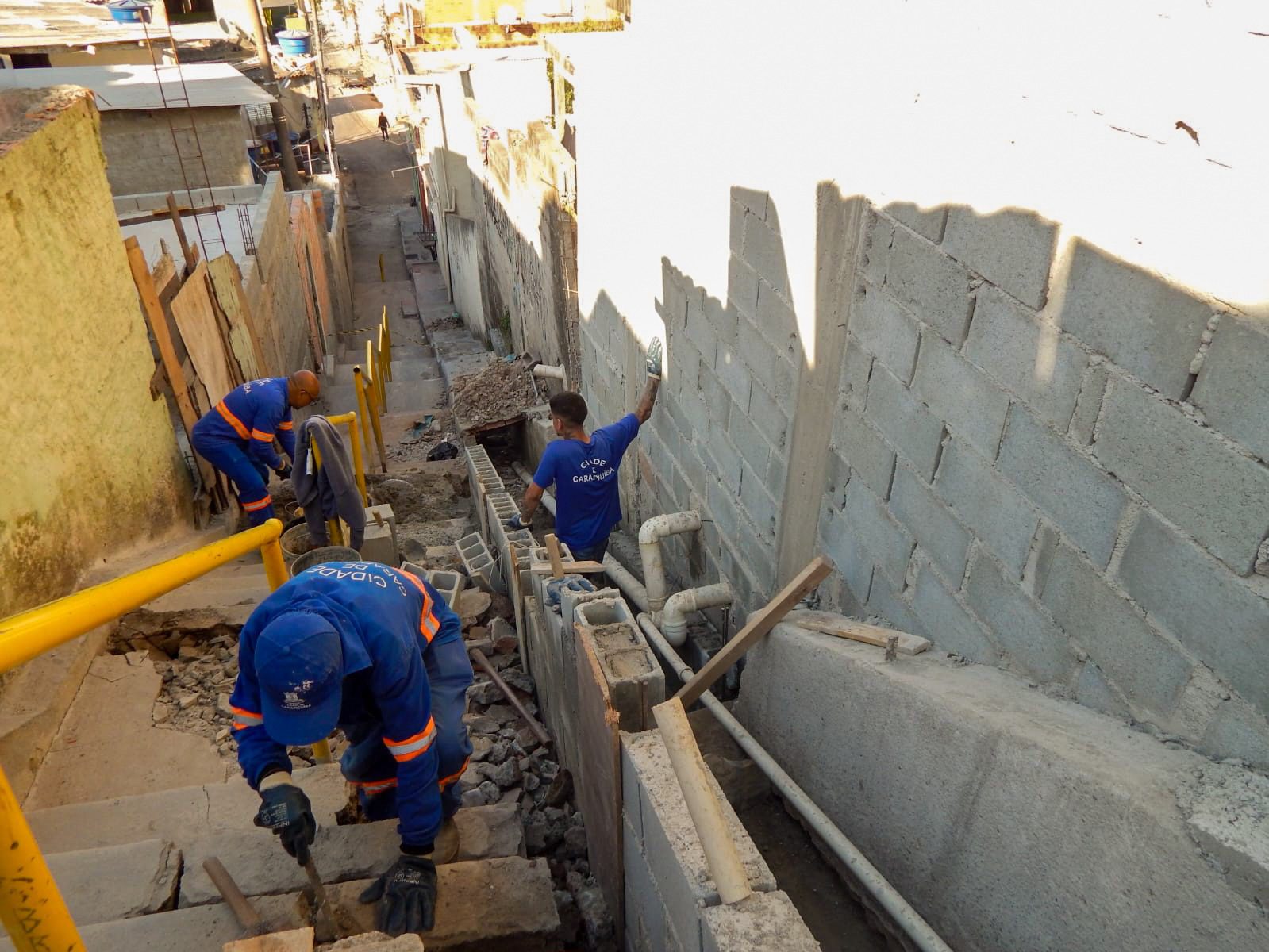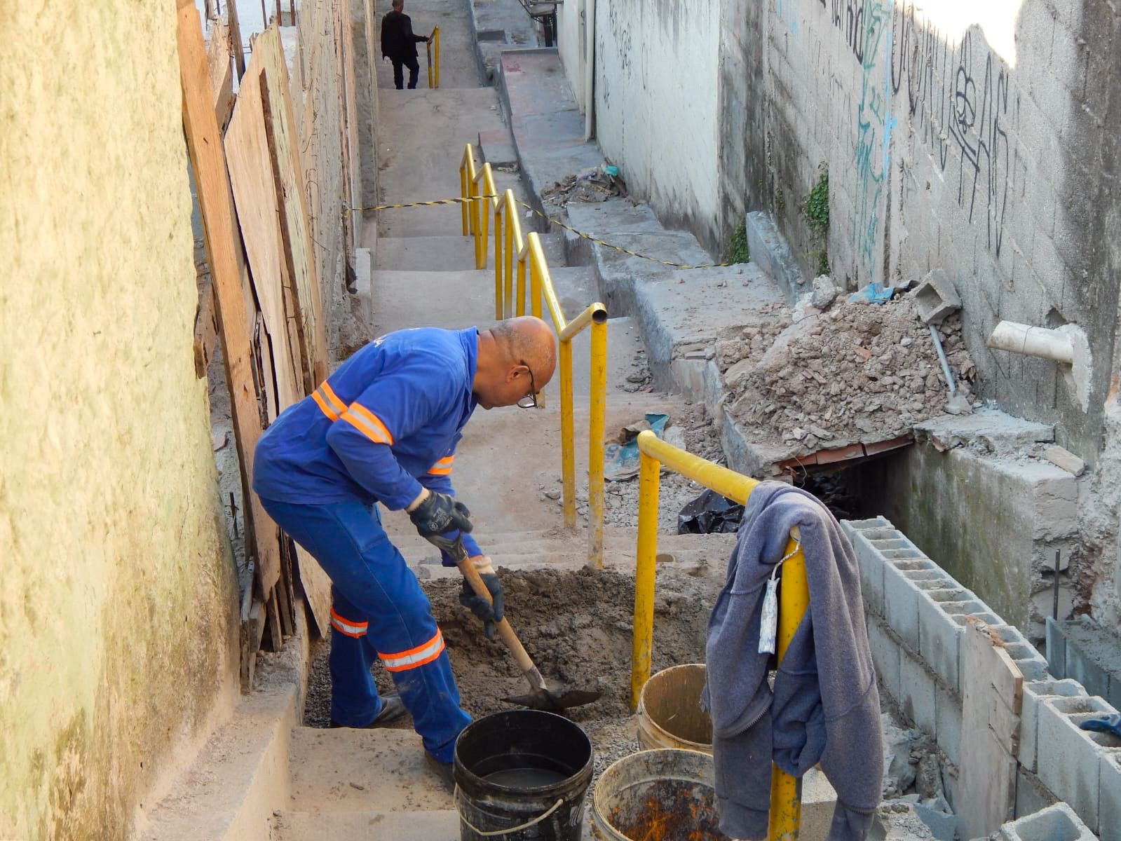 Outro exemplo importante de zeladoria é a construção de escadas de alvenaria em vielas, proporcionando mais segurança no deslocamento de pedestres e melhorando o acesso para os moradores em áreas de aclive.