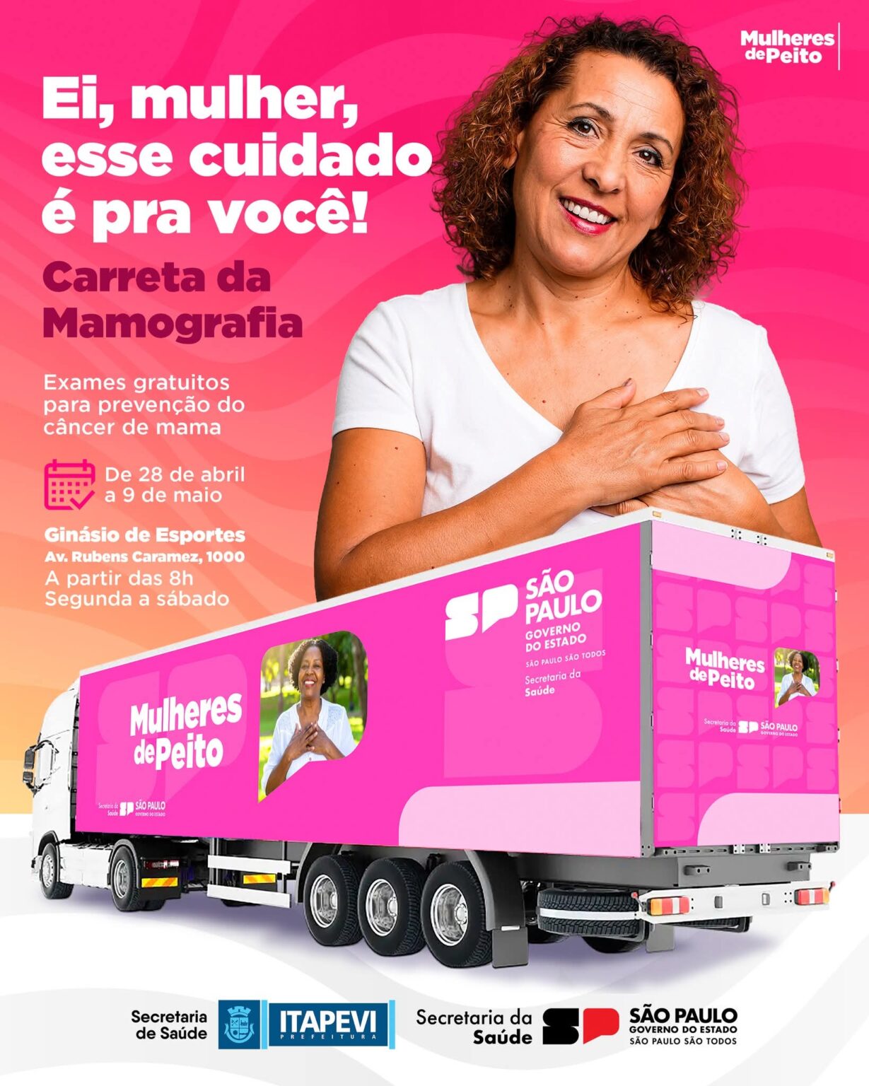 A cidade de Itapevi recebe, a partir desta terça-feira (28), os atendimentos da Carreta Mulheres de Peito, iniciativa voltada à prevenção e ao diagnóstico precoce do câncer de mama. A unidade móvel estará instalada no Ginásio de Esportes, com início dos atendimentos às 8h.