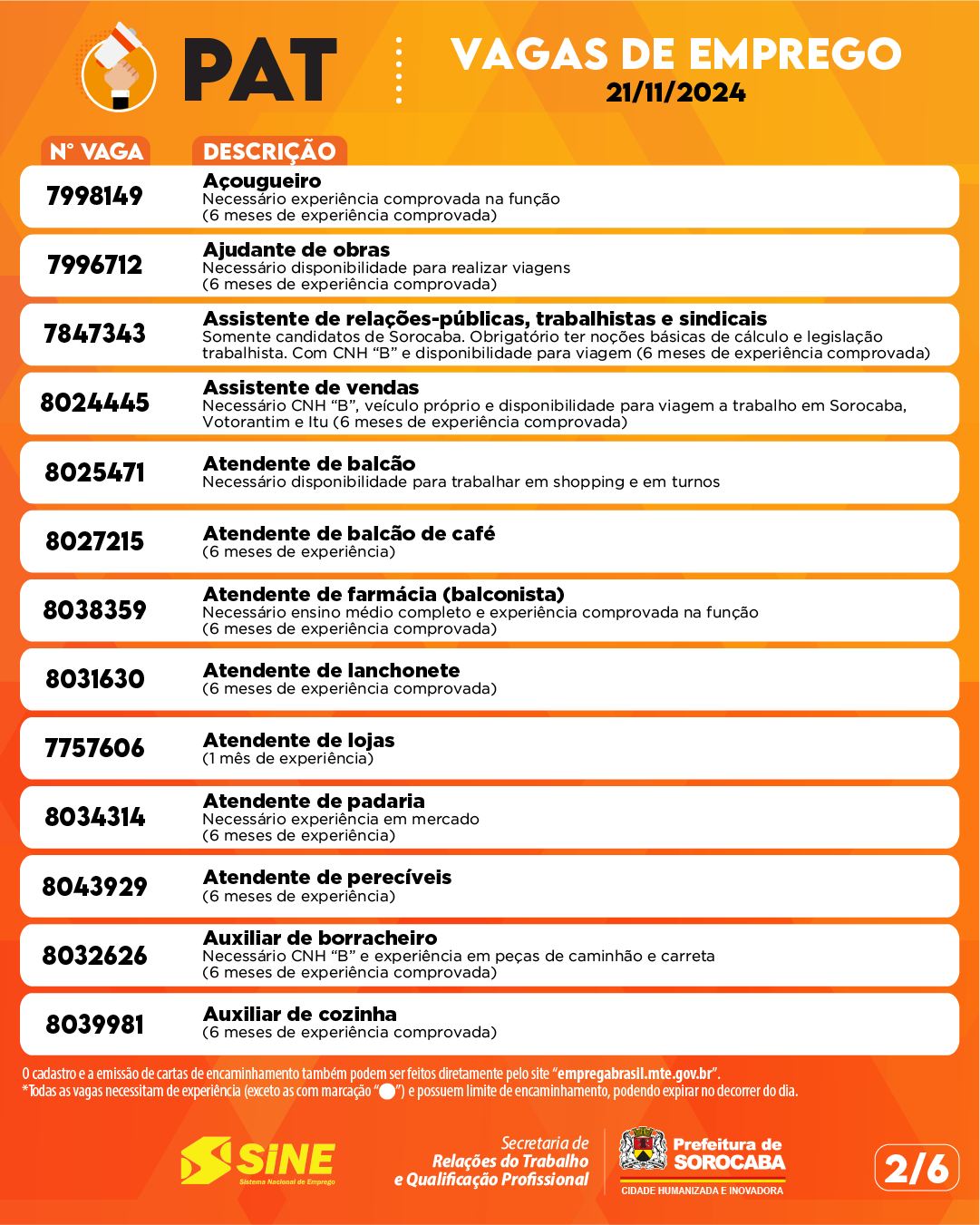 Na parte inferior, a legenda: O cadastro e a emissão de encaminhamento também podem ser feitos diretamente pelo site “empregabrasil.mte.gov.br”. Todas as vagas necessitam de experiência (exceto com marcação “°”) e possuem limite de encaminhamento, podendo expirar no decorrer do dia. No rodapé, os logos do Sistema Nacional de Empregos – SINE e da Secretaria de Relações de Trabalho e Qualificação Profissional/Prefeitura de Sorocaba.
