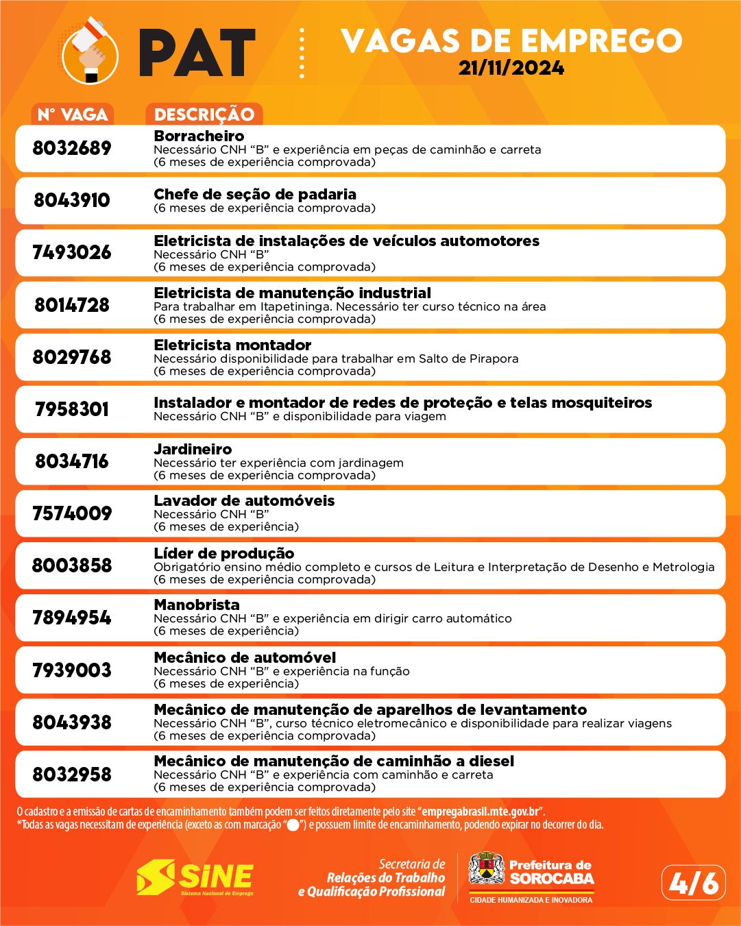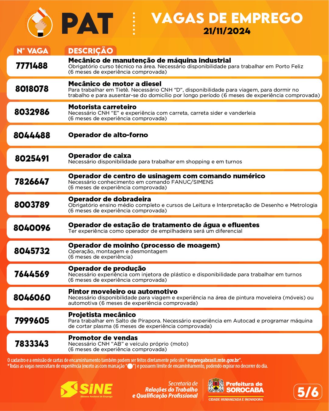 Confira as vagas de emprego oferecidas pelo PAT Sorocaba para esta quinta-feira, 21 de novembro de 2024!