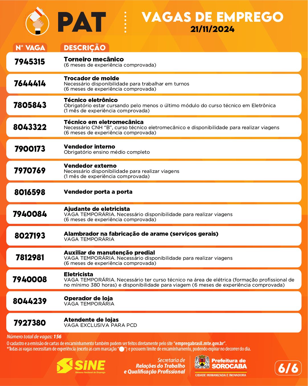Artes em carrossel, nos tons de laranja. Na parte superior, a ilustração de uma mão segurando um megafone e o título: PAT SOROCABA. Confira as vagas de emprego disponíveis para o dia 21/11/2024. Nas demais artes, todas as vagas disponíveis.
