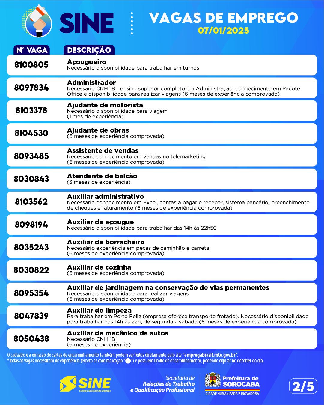 Confira as vagas oferecidas pelo Sine Municipal (antigo PAT) para esta terça-feira (07/01). Boa sorte!