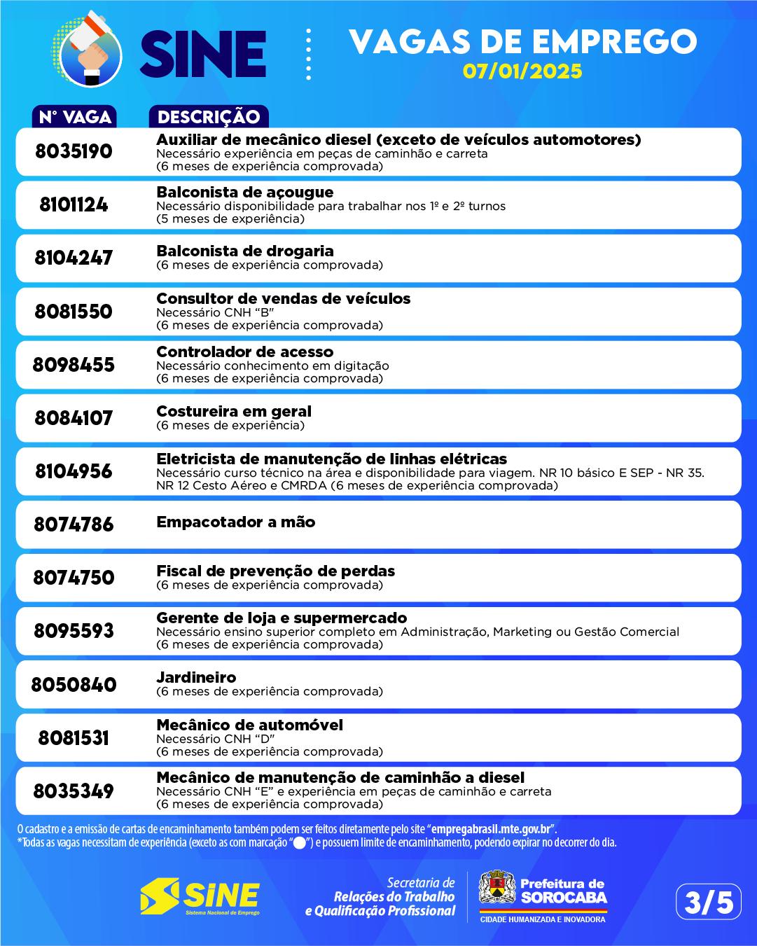 #PraTodosVerem: Artes em carrossel, nos tons de azul. Na parte superior, a ilustração de uma mão segurando um megafone e o título: SINE MUNICIPAL DE SOROCABA. Confira as vagas de emprego disponíveis para o dia 07/01/2025. Nas demais artes, todas as vagas disponíveis. Na parte inferior, a legenda: O cadastro e a emissão de encaminhamento também podem ser feitos diretamente pelo site “empregabrasil.mte.gov.br”. Todas as vagas necessitam de experiência (exceto com marcação “°”) e possuem limite de encaminhamento, podendo expirar no decorrer do dia. No rodapé, os logos do Sistema Nacional de Empregos – SINE e da Secretaria de Relações de Trabalho e Qualificação Profissional/Prefeitura de Sorocaba.