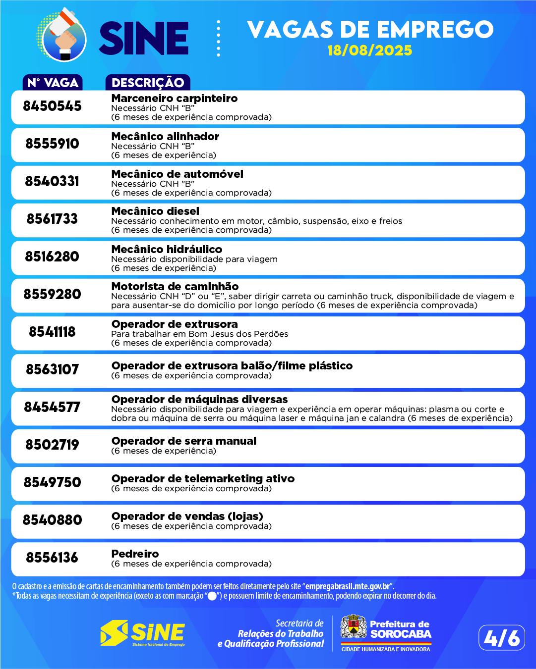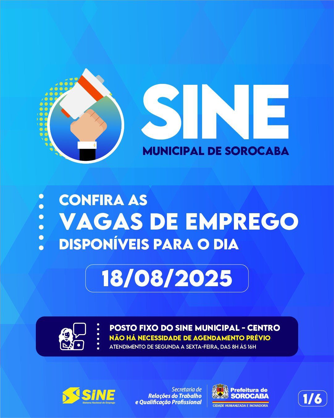 O Sine Municipal (antigo PAT) divulga novas oportunidades de emprego disponíveis nesta segunda-feira (18). Fique atento às unidades fixas e também ao Sine Móvel, que estará em dois pontos estratégicos da cidade ao longo do dia.