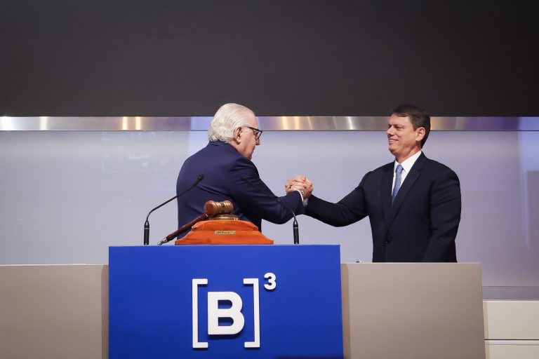 Guilherme Afif Domingos e o governador Tarcísio de Freitas no Leilão do Centro Administrativo. Foto: Pablo Jacob/Governo de SP