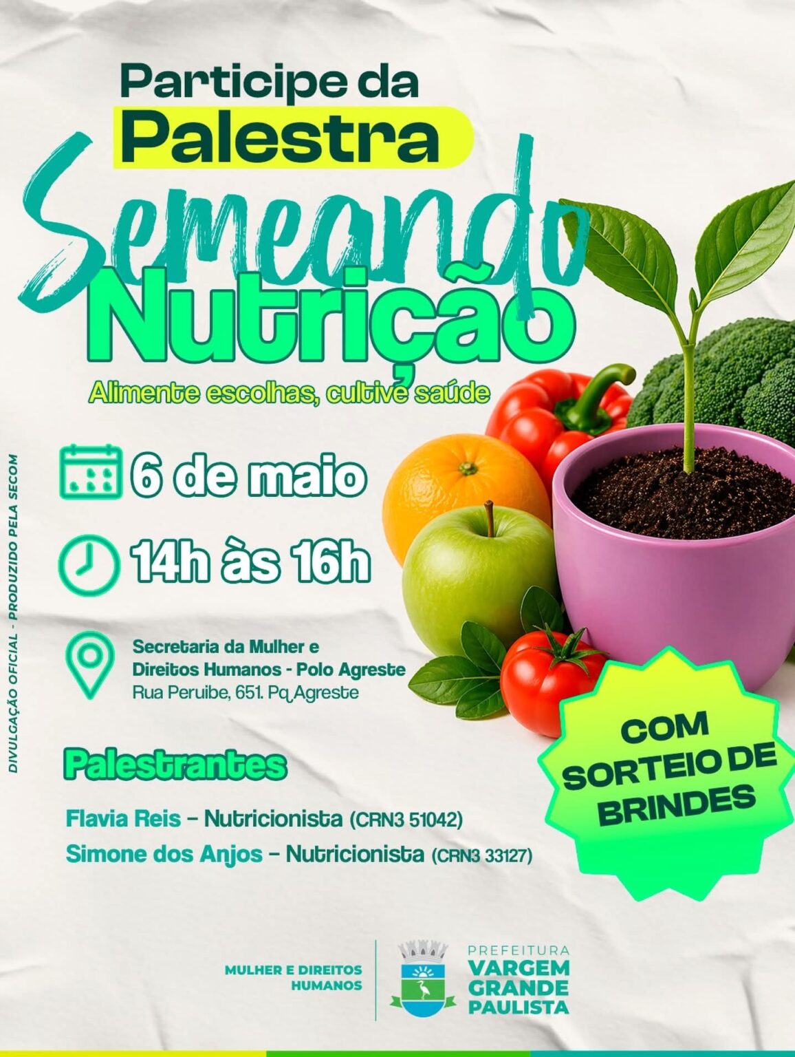 A Prefeitura de Vargem Grande Paulista, por meio da Secretaria da Mulher e Direitos Humanos, realiza no dia 6 de maio um encontro voltado à promoção da alimentação saudável e da qualidade de vida. A atividade acontece das 14h às 16h, na sede da Secretaria – Polo Agreste.