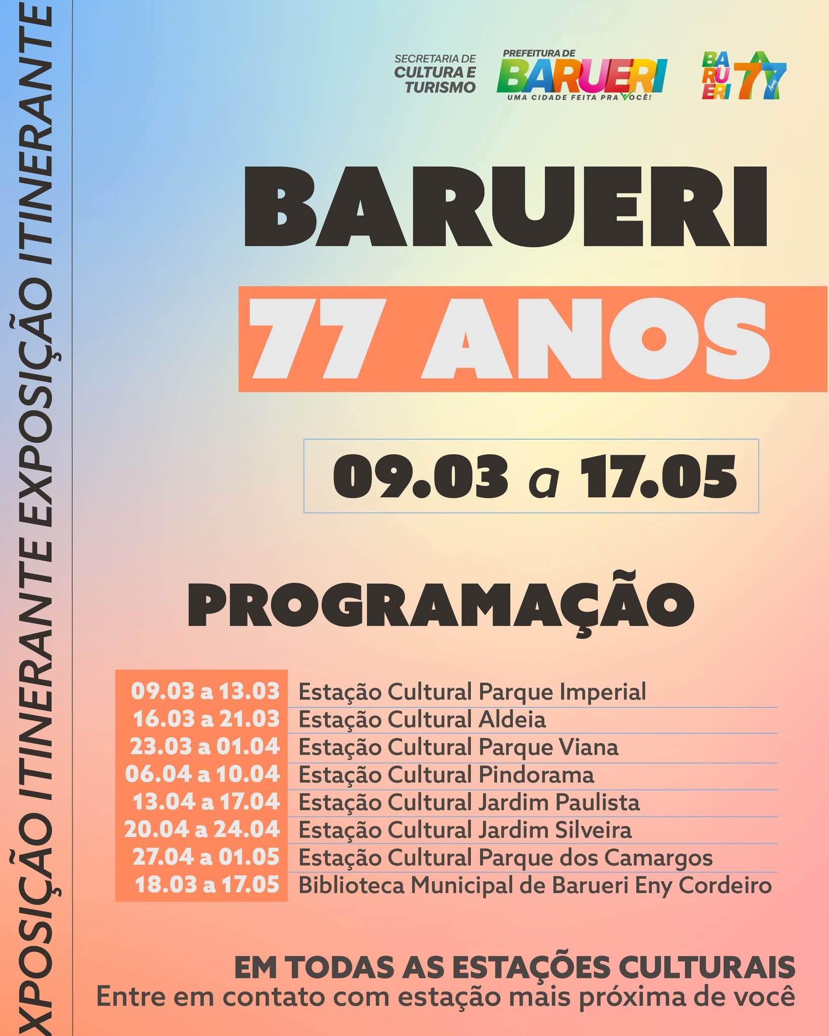 A programação percorre diversas Estações Culturais, passando por bairros como Parque Imperial, Aldeia, Parque Viana, Pindorama, Jardim Paulista, Jardim Silveira e Parque dos Camargos. Além disso, a exposição também está disponível na Biblioteca Municipal Eny Cordeiro durante todo o período.