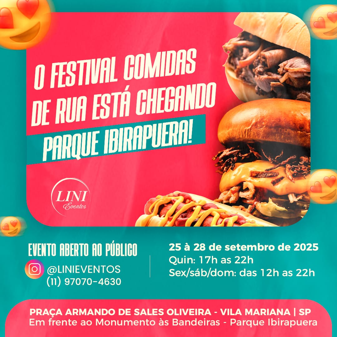 Entre os dias 25 e 28 de setembro de 2025, o Parque Ibirapuera, um dos principais cartões-postais de São Paulo, recebe o Festival de Comidas de Rua, evento gastronômico promovido pela Lini Eventos que promete reunir sabores de diversas regiões do Brasil e do mundo em um só lugar. A entrada é gratuita e a programação é aberta ao público de todas as idades.