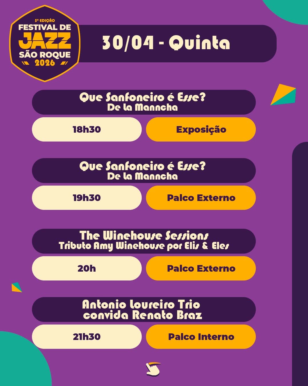 A expectativa é de grande público ao longo dos quatro dias, reforçando o Festival de Jazz como um importante vetor de difusão cultural em São Roque.