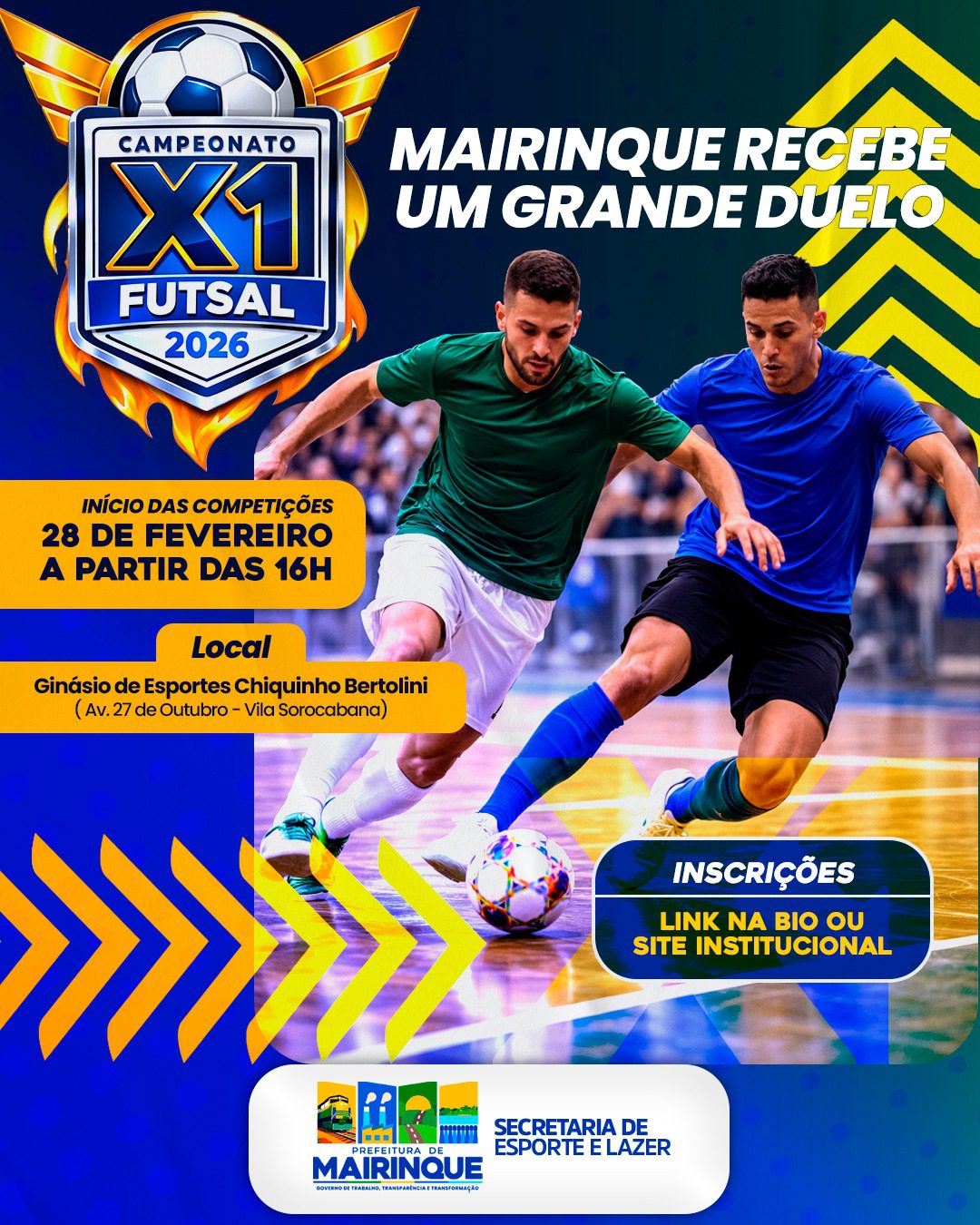 A Prefeitura de Mairinque, por meio da Secretaria de Esporte e Lazer, está com inscrições abertas para o Campeonato X1 de Futsal 2026, competição que promete grandes duelos, técnica e muita emoção em quadra. A iniciativa reforça o compromisso da Administração Municipal com o incentivo ao esporte, à integração social e à promoção de qualidade de vida.