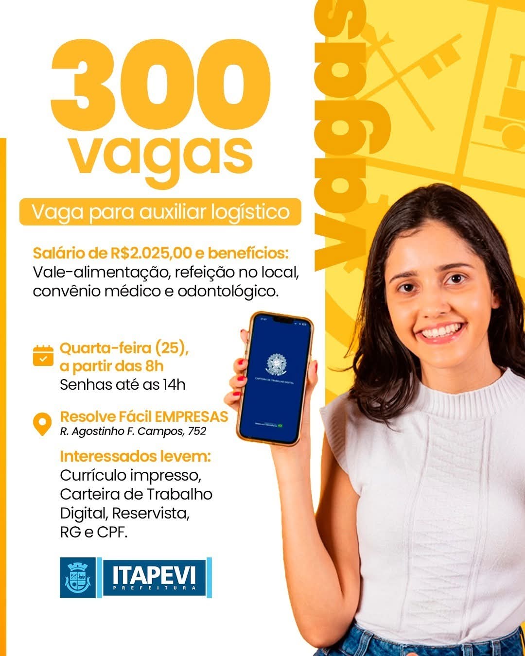 🚨 Oportunidade de emprego em Itapevi! A Prefs realiza, nesta quarta-feira (25), a partir das 8h30, processo seletivo com 300 vagas para auxiliar logístico, em parceria com o Mercado Livre.