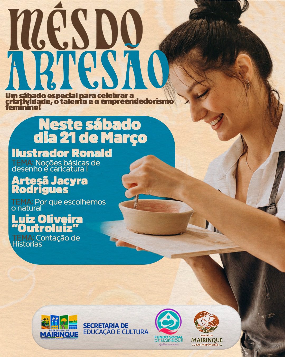 A Prefeitura de Mairinque, por meio da Secretaria de Educação e Cultura, em parceria com o Fundo Social de Solidariedade, realiza neste sábado, dia 21 de março, uma programação especial em celebração ao Mês do Artesão.