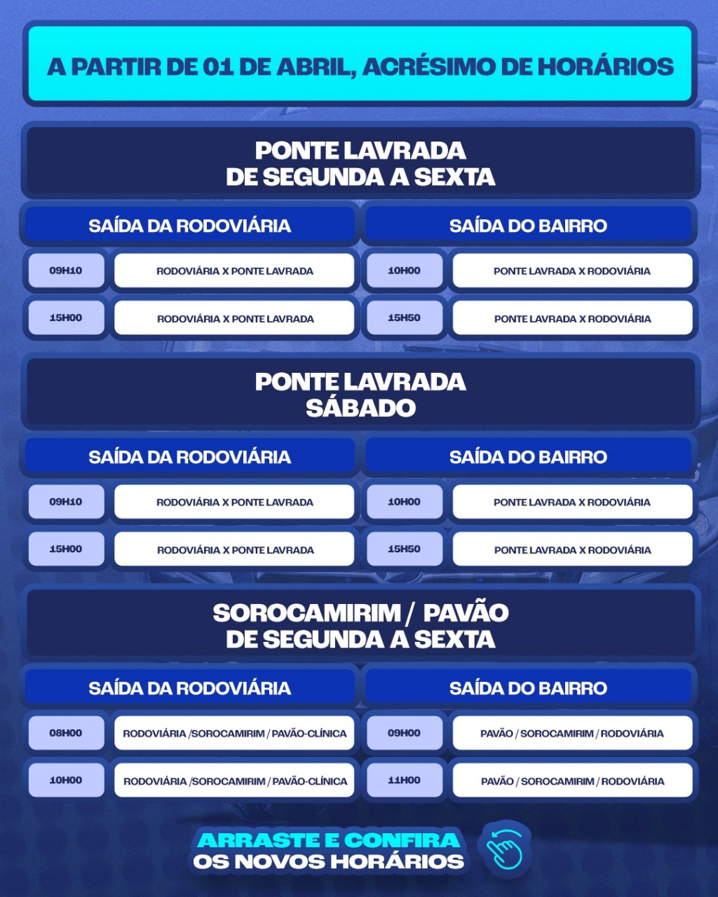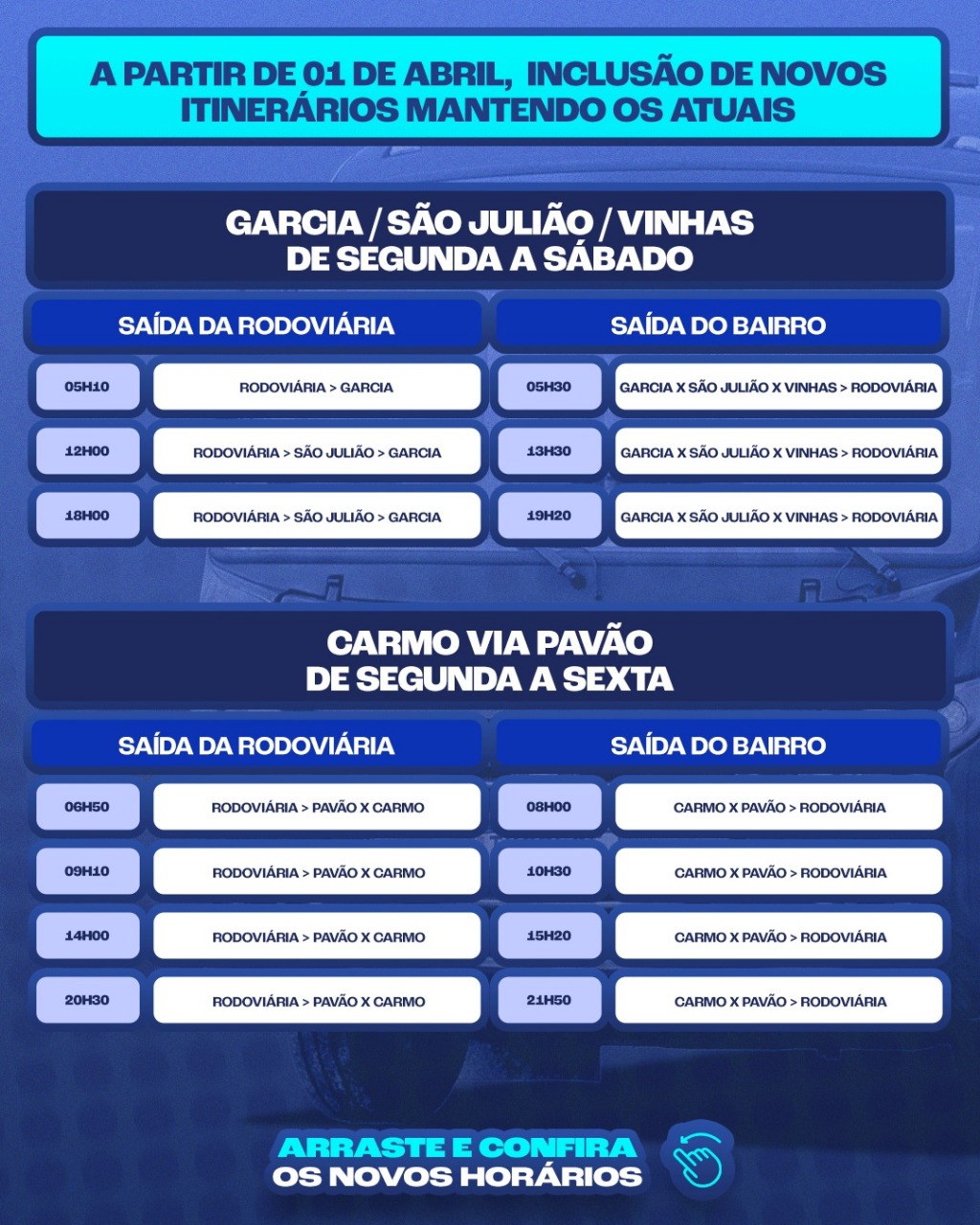 A partir de 1º de abril, os moradores das regiões do São Julião, Garcia, Vila Vinhas, Sorocamirim, Carmo e Pavão terão novas opções de transporte público. O município receberá três micro-ônibus que passarão a atender essas regiões, trazendo não só mais conforto e segurança, como também reforçando os horários de transporte.