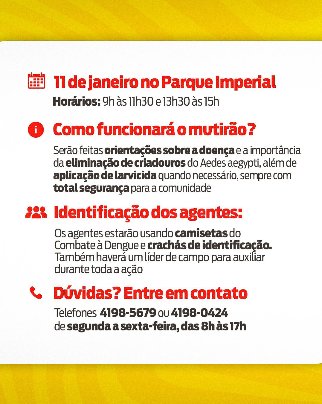 No dia 11/01/2025, haverá um mutirão crucial contra a Dengue em nossa comunidade. É essencial que todos estejam cientes e participem ativamente deste esforço coletivo para combatermos essa doença.
