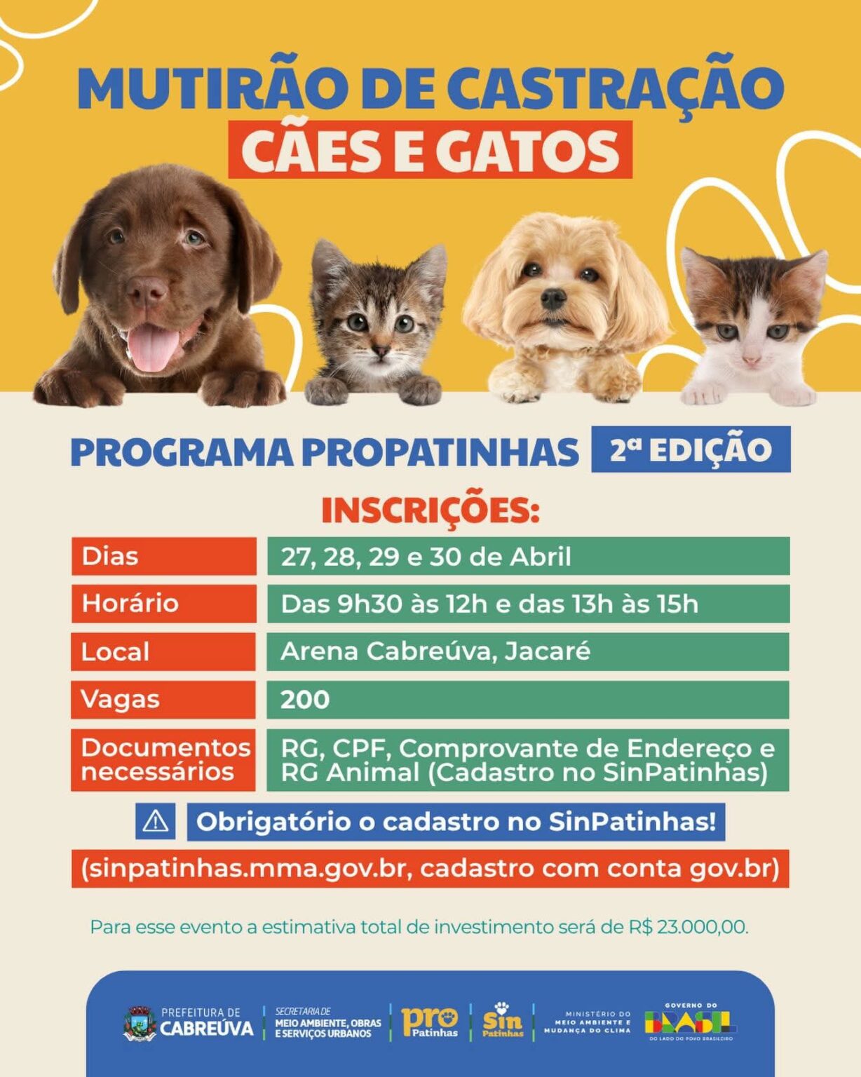 O cadastro no SinPatinhas é obrigatório e deve ser realizado antecipadamente pelo site oficial, com acesso via conta gov.br. A iniciativa conta com um investimento estimado de R$ 23 mil, reforçando o compromisso da administração municipal com políticas públicas voltadas à causa animal e ao meio ambiente.
