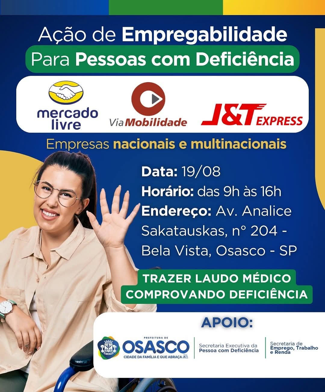 A Prefeitura de Osasco, por meio da Secretaria Executiva da Pessoa com Deficiência (SEPCD) e da Secretaria de Emprego, Trabalho e Renda (SETRE), realiza no dia 19 de agosto, das 9h às 16h, uma grande ação de empregabilidade voltada exclusivamente para pessoas com deficiência (PcDs).
