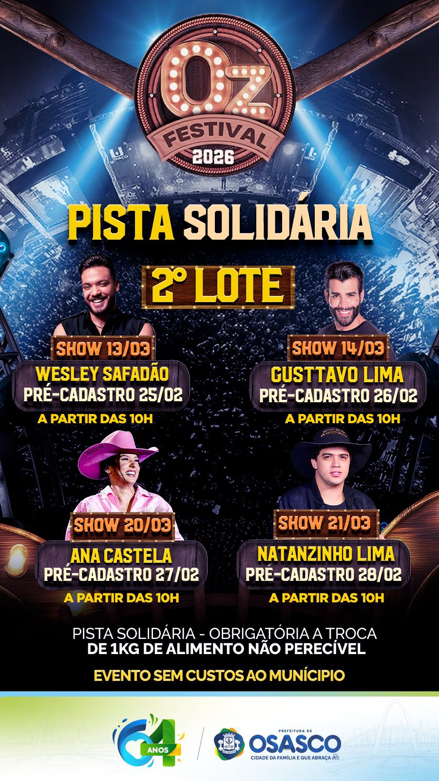 A cidade de Osasco já se prepara para mais uma edição do OZ Festival 2026, que terá grandes atrações nacionais e contará com o tradicional ingresso solidário para acesso à pista. O público interessado deve realizar o pré-cadastro on-line para cada dia de evento.