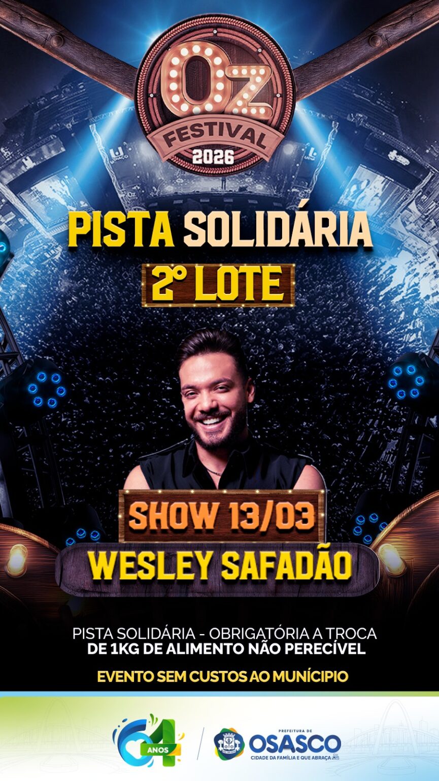 OZ Festival 2026 abre pré-cadastro para o show de Wesley Safadão em Osasco, com ingresso solidário e expectativa de grande público no evento. Foto: Prefeitura De Osasco