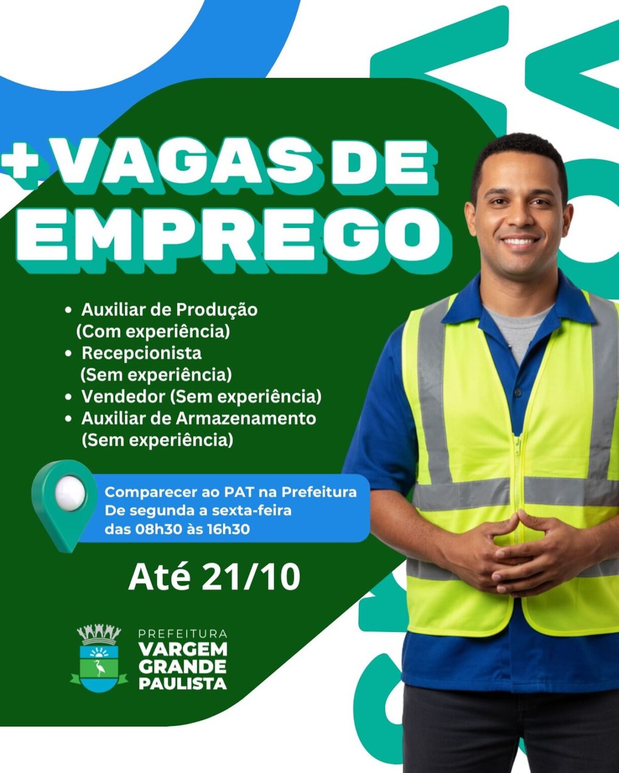O Posto de Atendimento ao Trabalhador (PAT) de Vargem Grande Paulista está com novas oportunidades abertas para quem busca ingressar ou se recolocar no mercado de trabalho.
