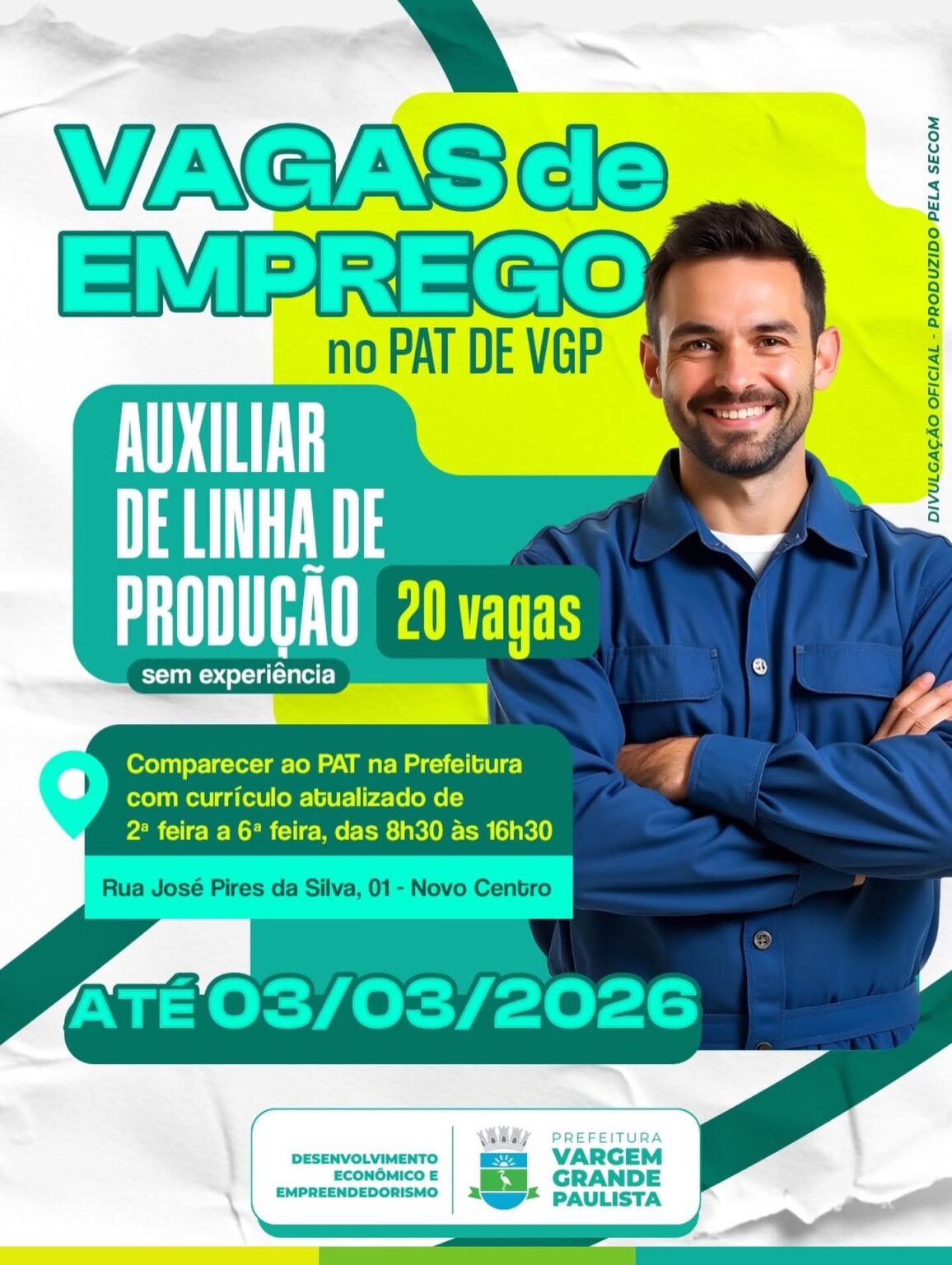 O Posto de Atendimento ao Trabalhador (PAT) de Vargem Grande Paulista está com 20 vagas abertas para o cargo de Auxiliar de Linha de Produção. A oportunidade é destinada a candidatos que buscam inserção no mercado de trabalho e não exige experiência prévia.