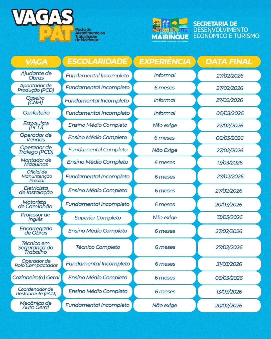 A Prefeitura de Mairinque, por meio da Secretaria de Desenvolvimento Econômico, anuncia as vagas disponíveis no Posto de Atendimento ao Trabalhador (PAT). São mais de 15 oportunidades em diversos segmentos.