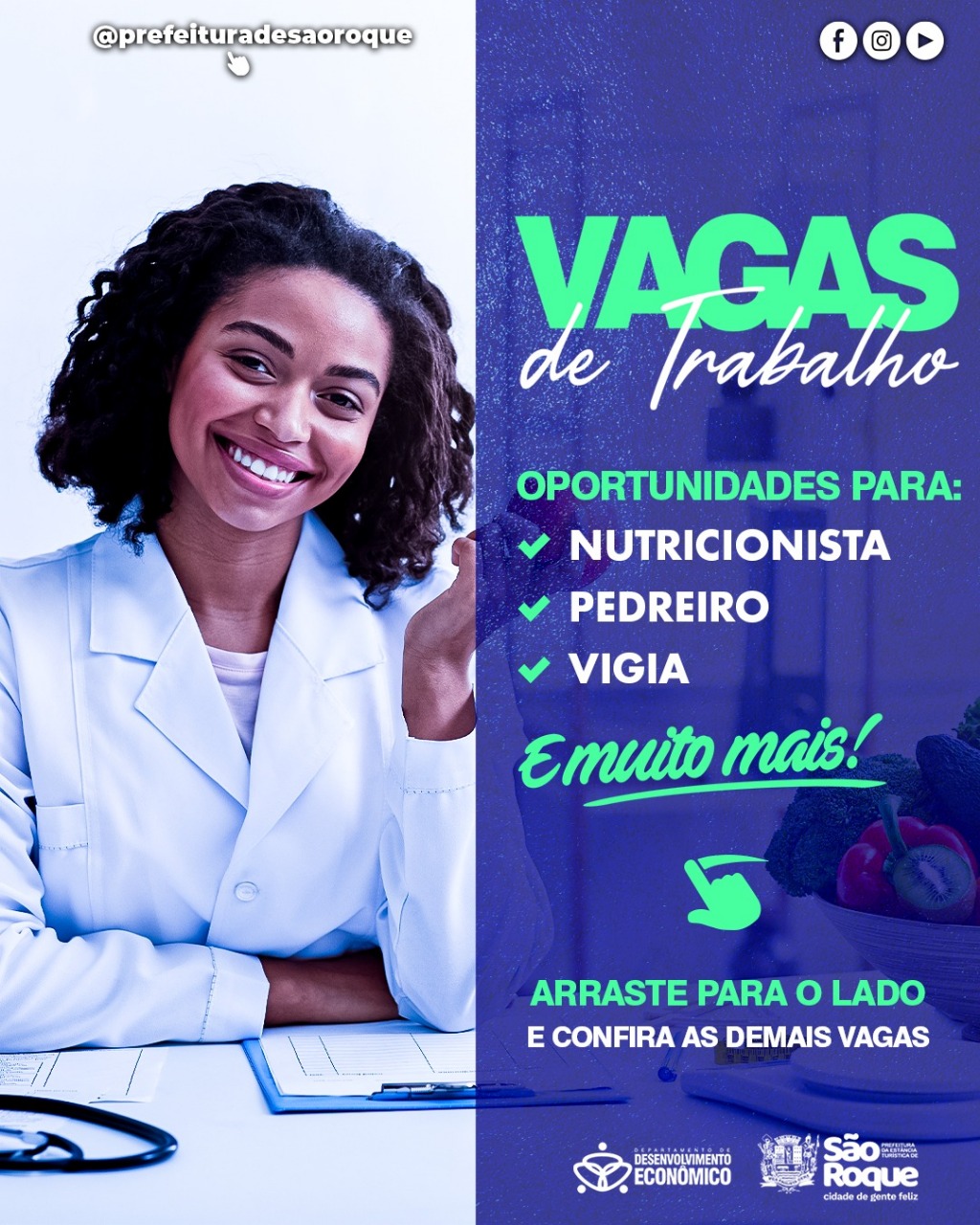 A Prefeitura de São Roque divulga hoje as vagas de emprego cadastradas no Posto de Atendimento ao Trabalhador (PAT). São mais de 63 oportunidades de trabalho em mais de 44 áreas, com destaque para as novas vagas nas áreas de Nutricionista, Pedreiro, Vigia, entre outras.