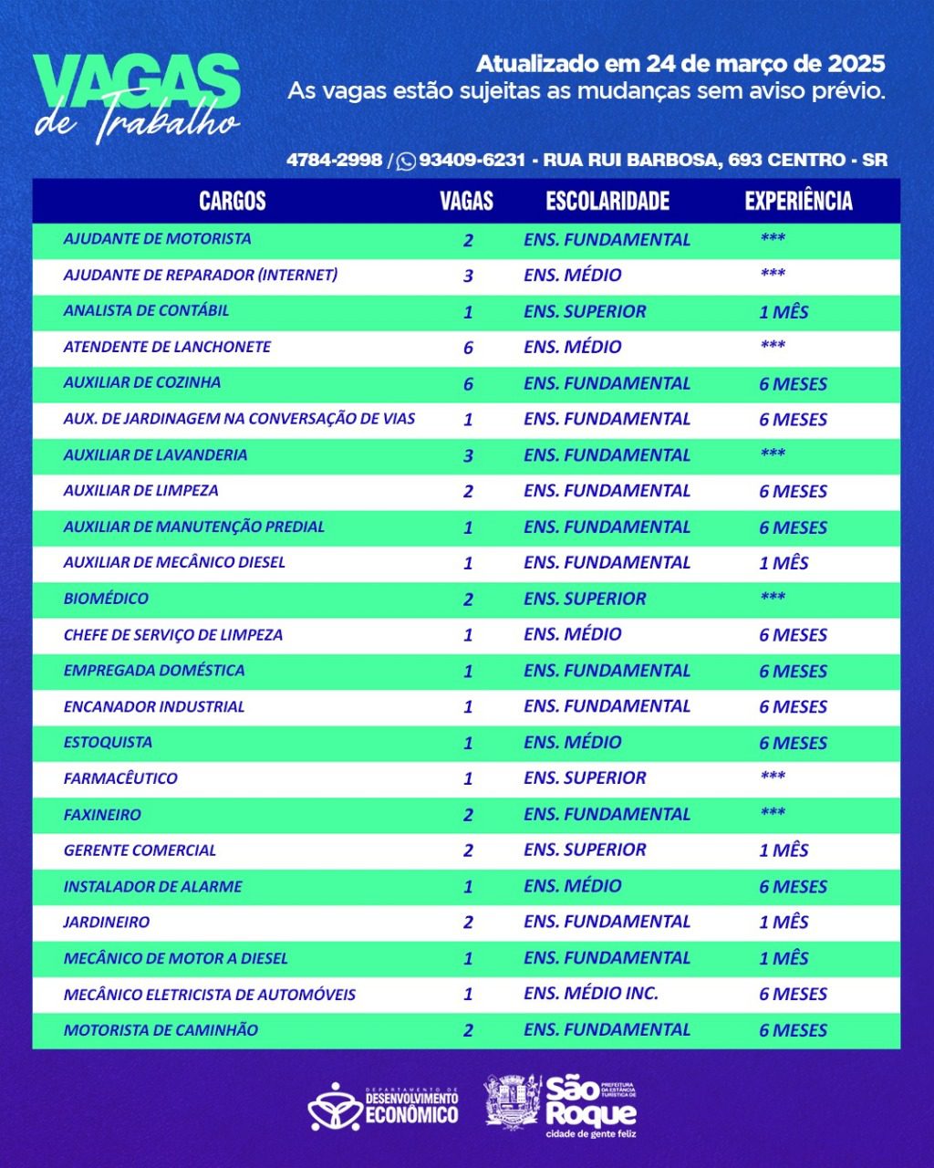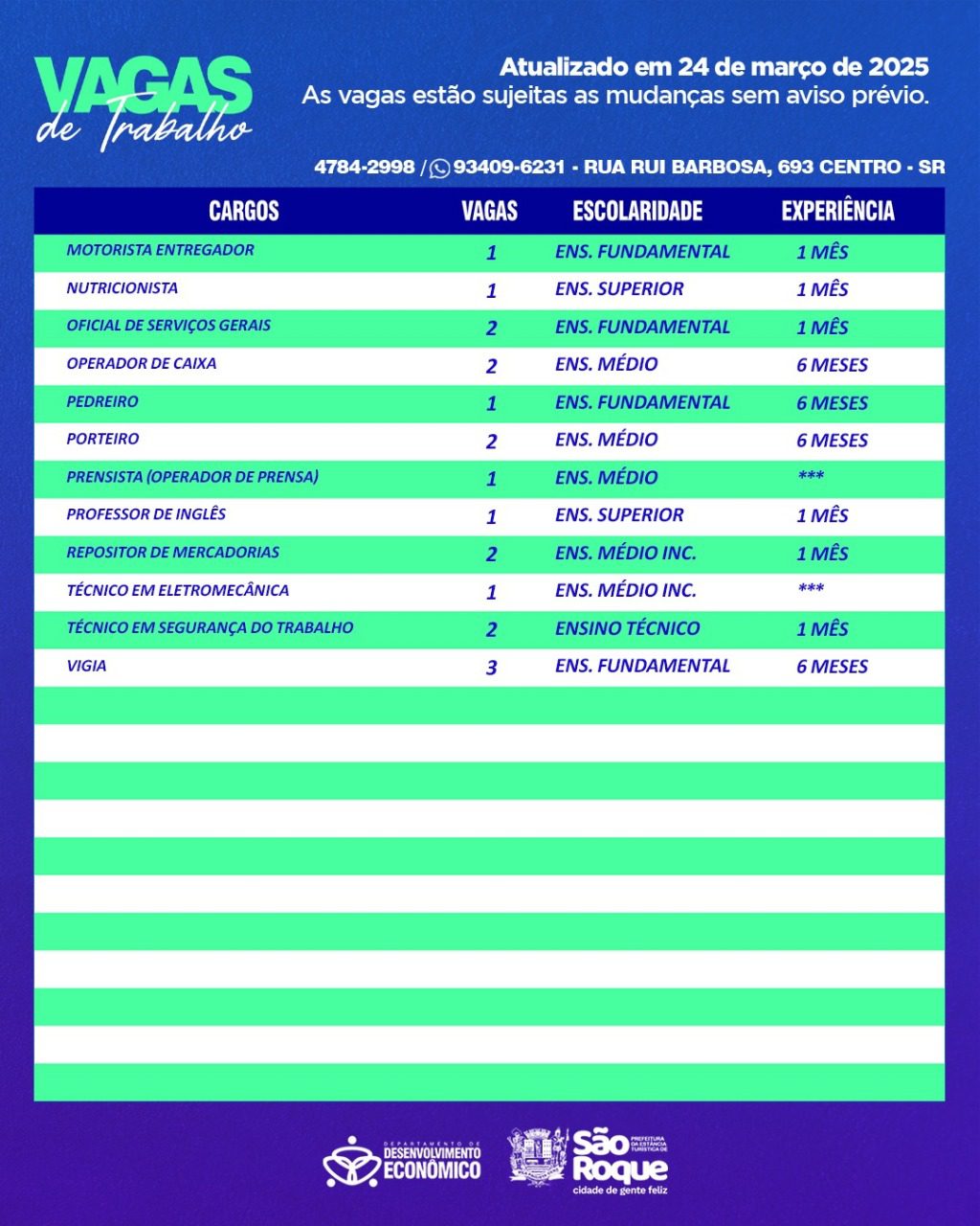 A carta de encaminhamento também pode ser retirada diretamente no PAT São Roque, mediante agendamento que pode ser feito através dos Serviços Online. As vagas são atualizadas semanalmente e estão sujeitas a alterações sem aviso prévio. Para mais informações, entre em contato com o PAT pelo telefone 4784-2998 ou pelo WhatsApp 93409-6231.