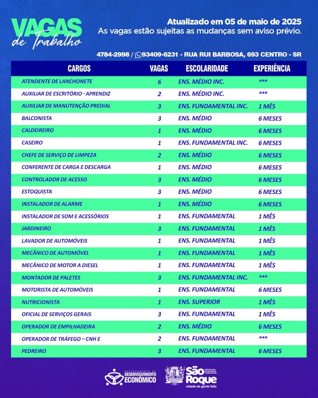 As vagas são atualizadas semanalmente e estão sujeitas a alterações sem aviso prévio. Para mais informações, entre em contato com o PAT pelo telefone (11) 93409 6231