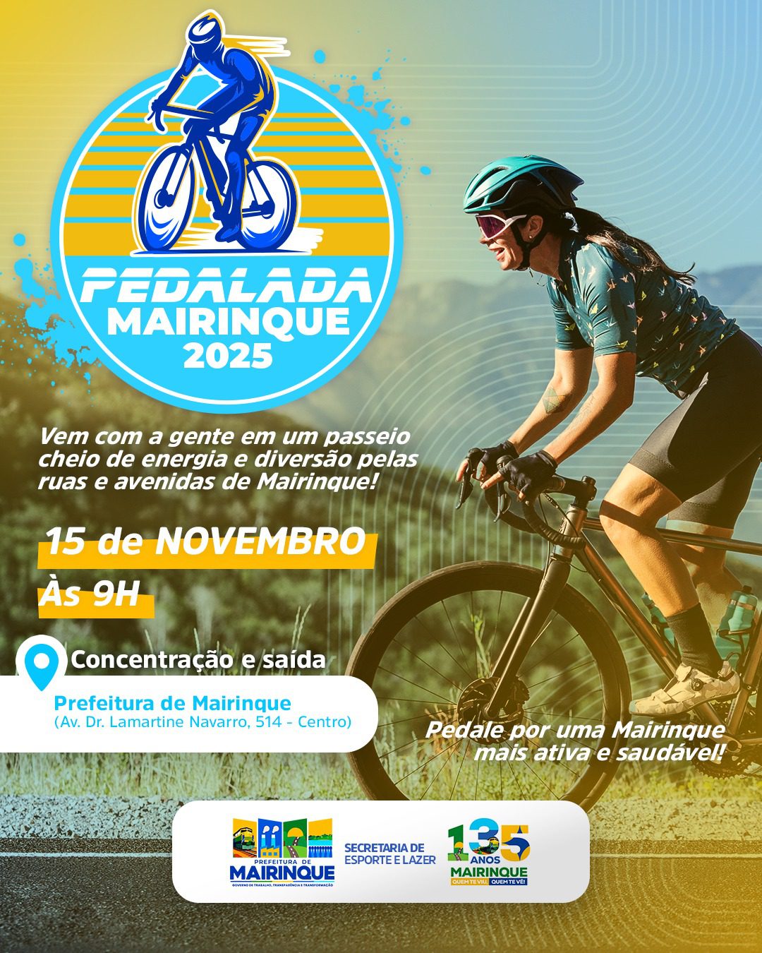 A Prefeitura de Mairinque convida todos os moradores a participarem do Pedala Mairinque 2025, um passeio ciclístico que promete movimentar a cidade em uma manhã de lazer, saúde e integração. O evento acontecerá no dia 15 de novembro, com saída às 9h, em frente ao Paço Municipal.