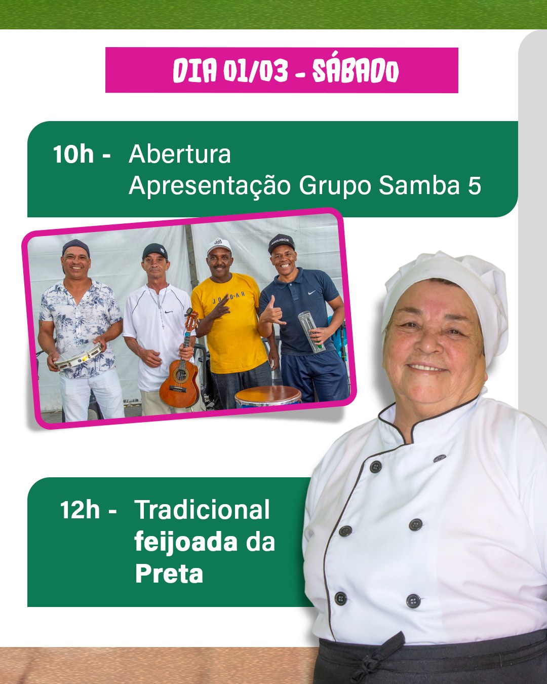 Além da música, a feijoada da Preta, tradicional na cidade, estará disponível todos os dias, garantindo que o samba seja acompanhado de uma deliciosa refeição típica. A festa começa às 10h e promete muita diversão, com samba de qualidade e uma experiência gastronômica única.