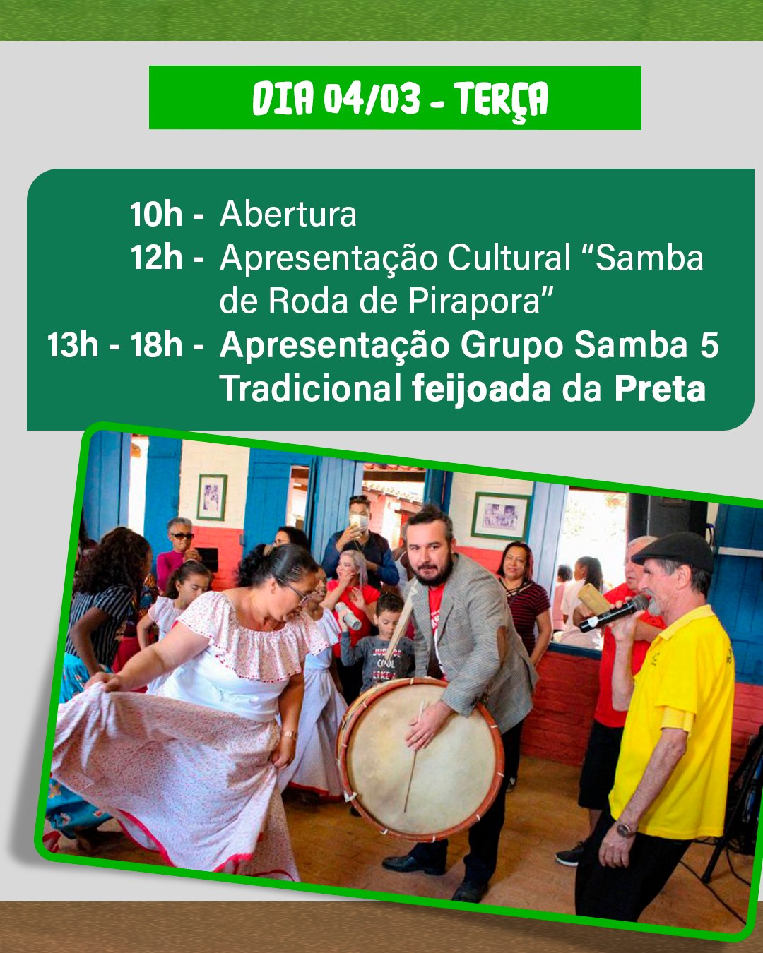 A festa começa no sábado (1), com o Grupo Samba 5, que se apresentará todos os dias durante o evento. A festa continua no domingo (2) e na terça-feira (4) com o tradicional Samba de Roda de Pirapora, que leva a verdadeira essência do samba para o público. As apresentações acontecem a partir do meio-dia, com muita música e animação para todos os foliões.