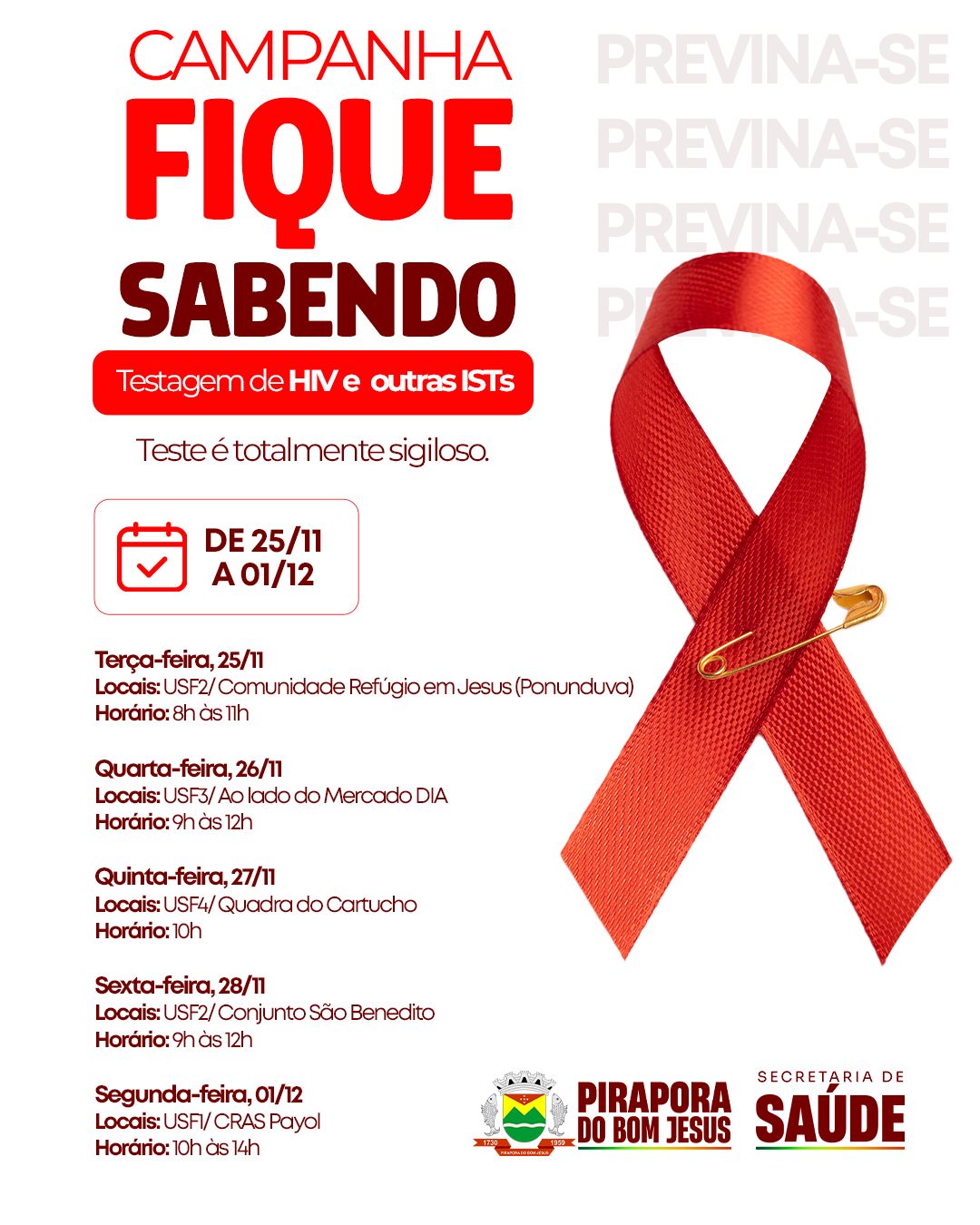 A partir de terça, Pirapora do Bom Jesus entra em ação pela prevenção! Testes rápidos, sigilosos e acessíveis perto de você. A saúde agradece — e o futuro também.