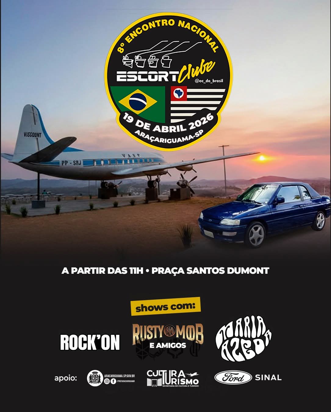 No dia 19 de abril, das 11h às 19h, com entrada gratuita, a Praça Santos Dumont (Avião) será palco do 8º Encontro Nacional Escort Clube. Um evento que reúne apaixonados por automobilismo, história e cultura automotiva, celebrando a tradição e a paixão pelo Ford Escort.
