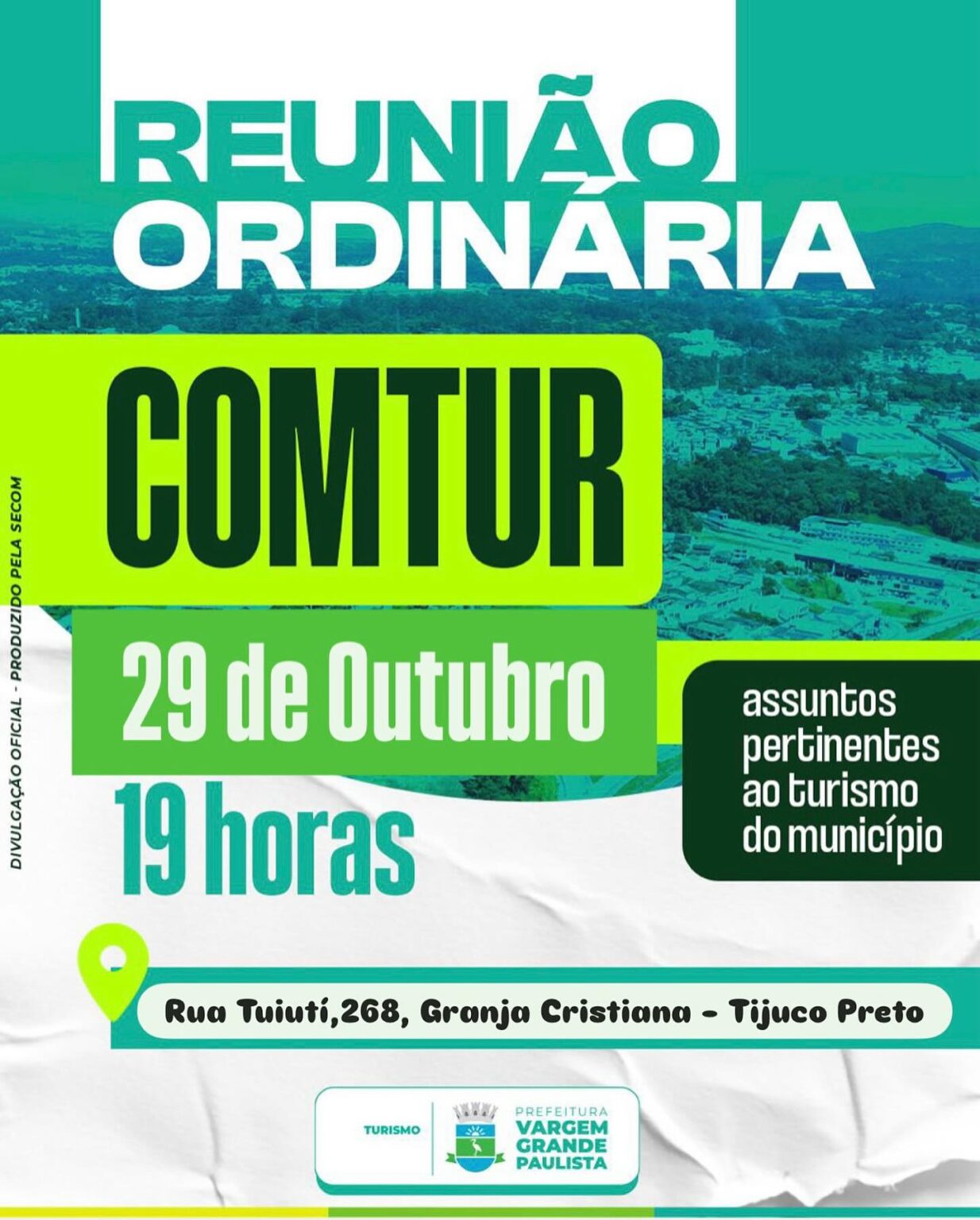A Prefeitura de Vargem Grande Paulista convida todos os integrantes do trade turístico, empresários, comerciantes e moradores interessados no desenvolvimento do turismo local para participarem da próxima Reunião do Conselho Municipal de Turismo (COMTUR).