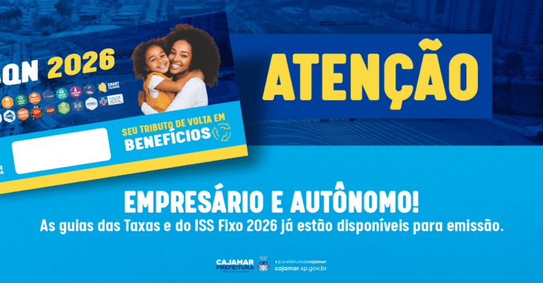 A Prefeitura de Cajamar, por meio da Secretaria Municipal de Fazenda e Gestão Estratégica, informa que as guias para o pagamento das Taxas de Poder de Polícia (Fiscalização de Funcionamento e Publicidade) e do ISSQN Fixo para o exercício de 2026 já estão disponíveis para emissão online.
