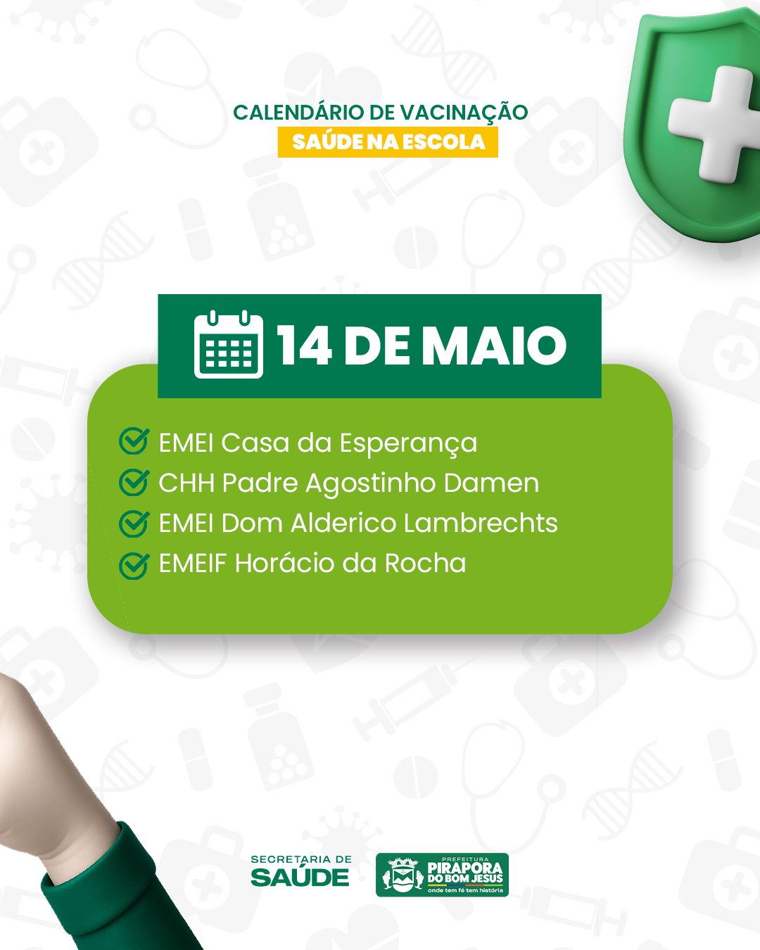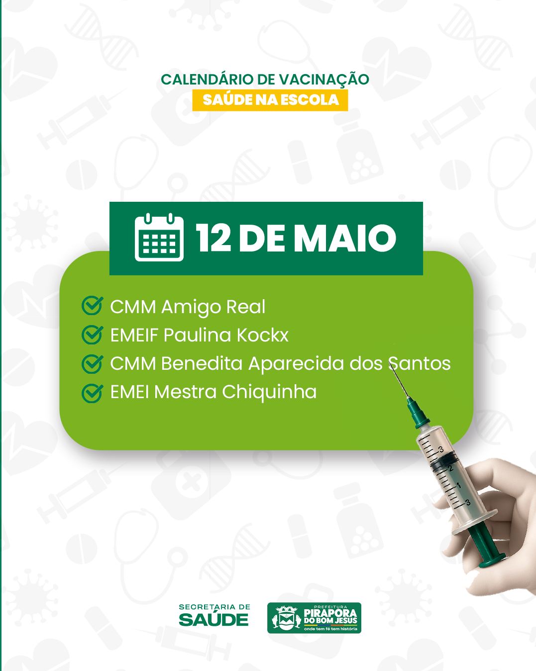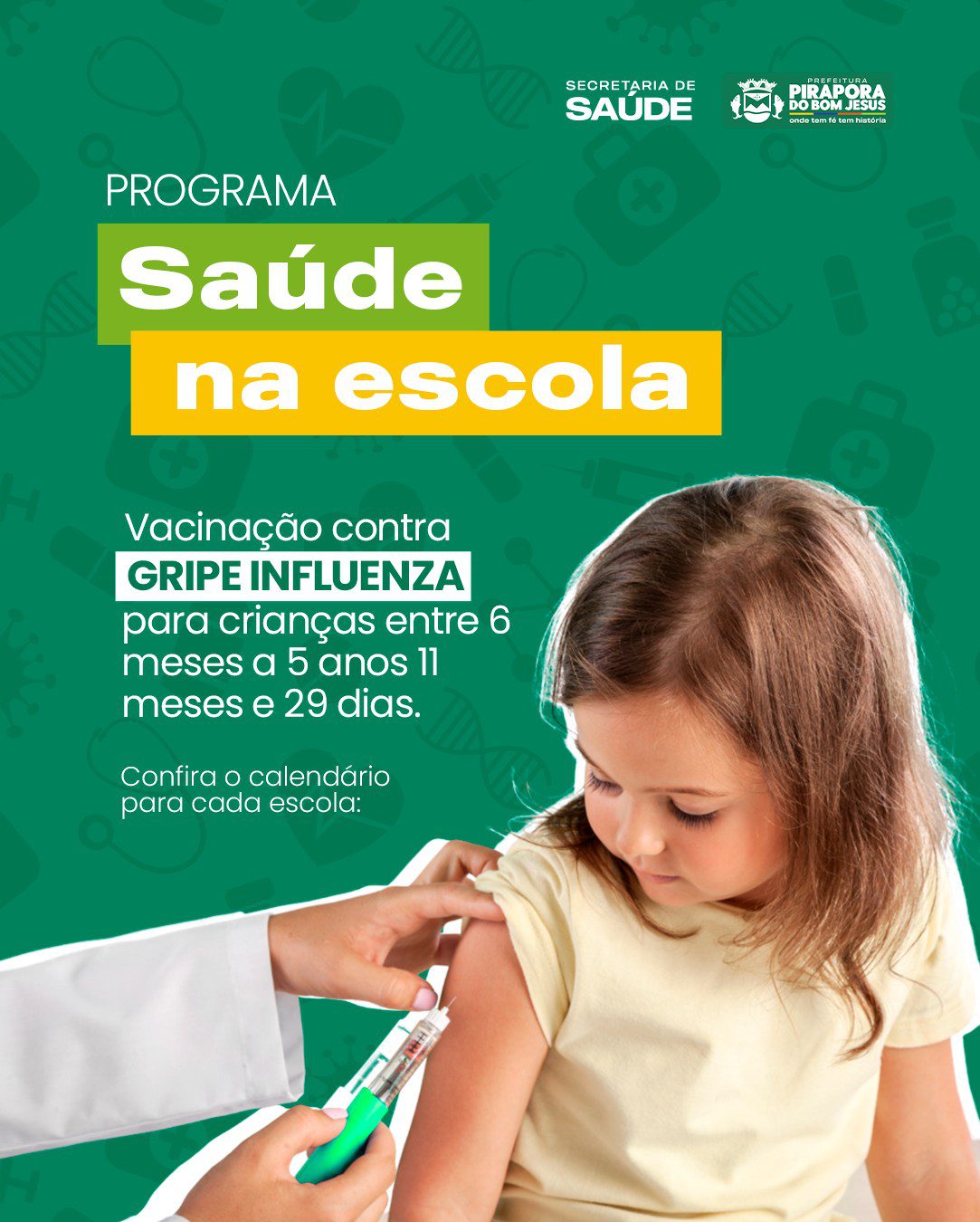 A Prefeitura de Pirapora do Bom Jesus, por meio da Secretaria Municipal de Saúde, inicia na próxima semana mais uma importante etapa do Programa Saúde na Escola. Entre os dias 12 e 16 de maio, será realizada a vacinação contra a gripe (Influenza) para crianças de 6 meses a 5 anos, 11 meses e 29 dias, diretamente nas unidades escolares do município.