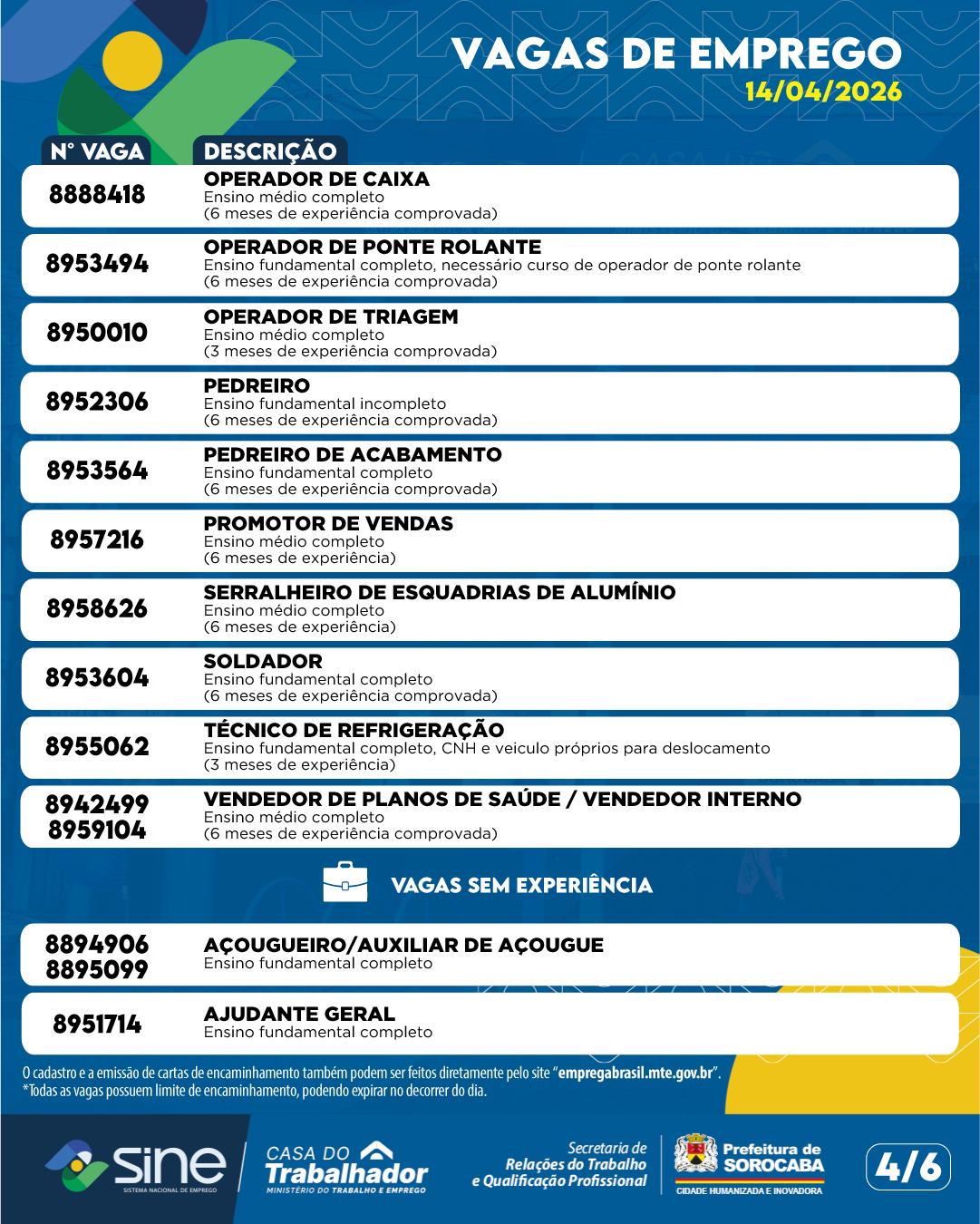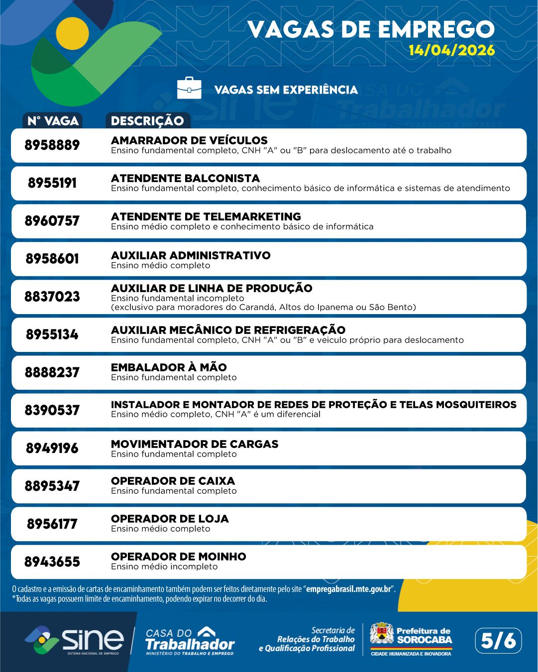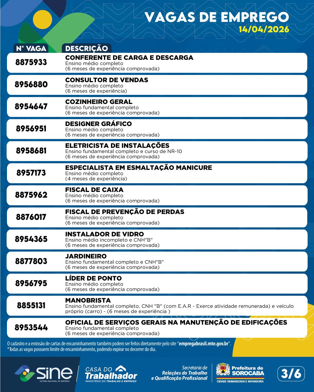 A Prefeitura de Sorocaba divulgou as vagas de emprego disponíveis por meio da Casa do Trabalhador para esta terça-feira (14), ampliando as oportunidades para quem busca inserção ou recolocação no mercado de trabalho.