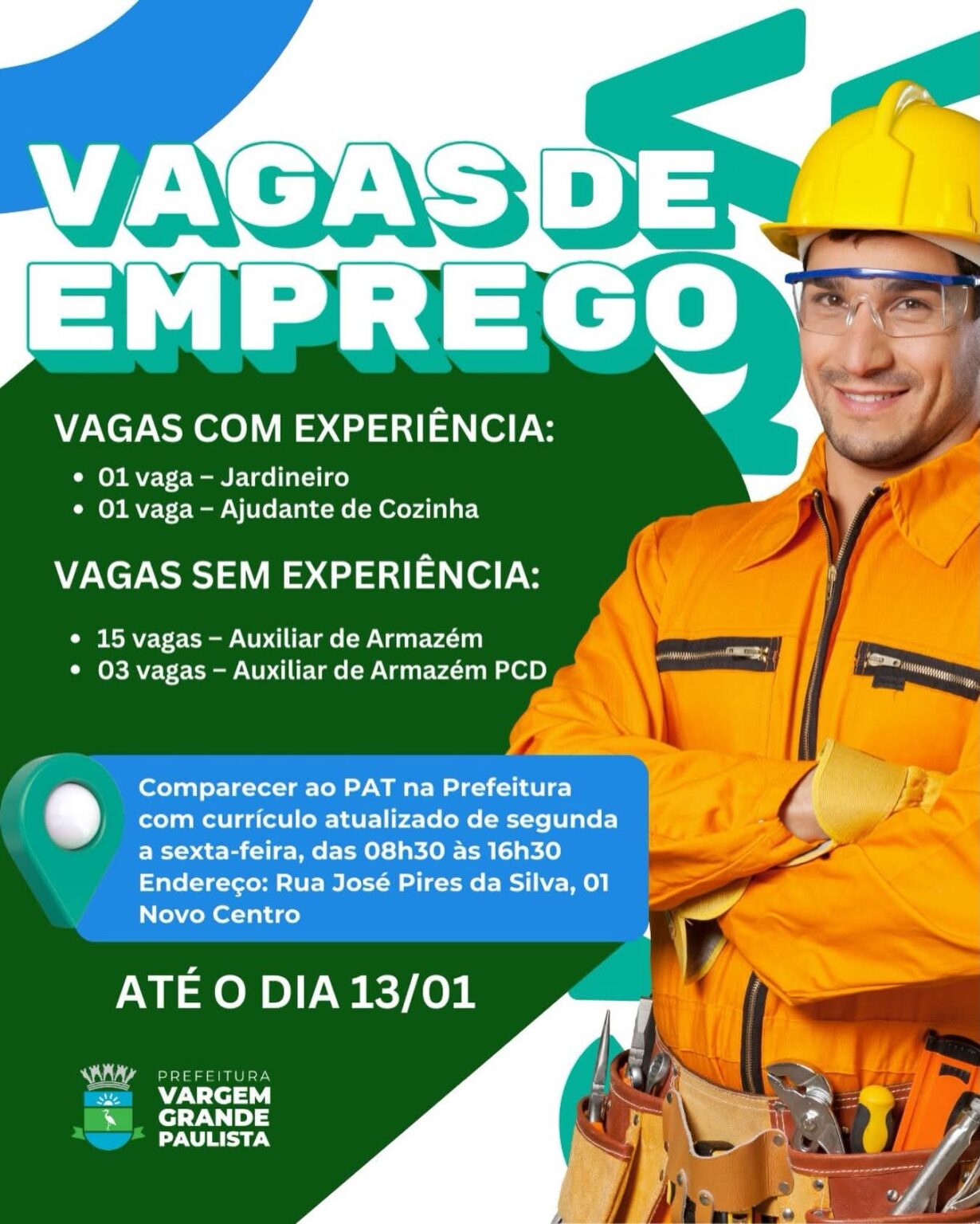 A Prefeitura de Vargem Grande Paulista abriu novas vagas de emprego no PAT. Tem oportunidade com e sem experiência — mas é por tempo limitado!