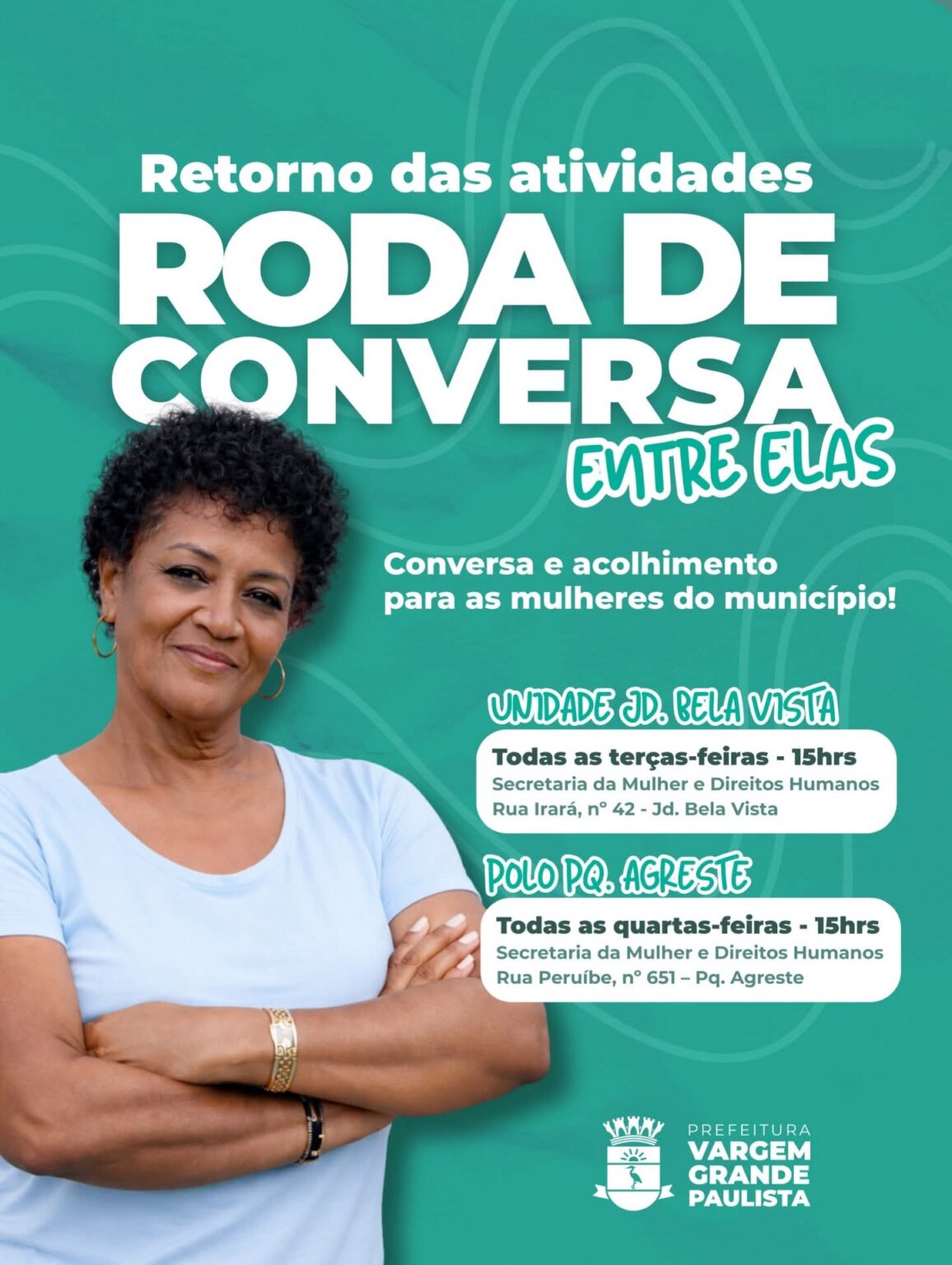 A Prefeitura de Vargem Grande Paulista, por meio da Secretaria da Mulher e Direitos Humanos, dará início nos dias 3 e 4 de março à Roda de Conversa “Entre Elas”, um espaço permanente de escuta, acolhimento e troca de experiências voltado às mulheres do município.